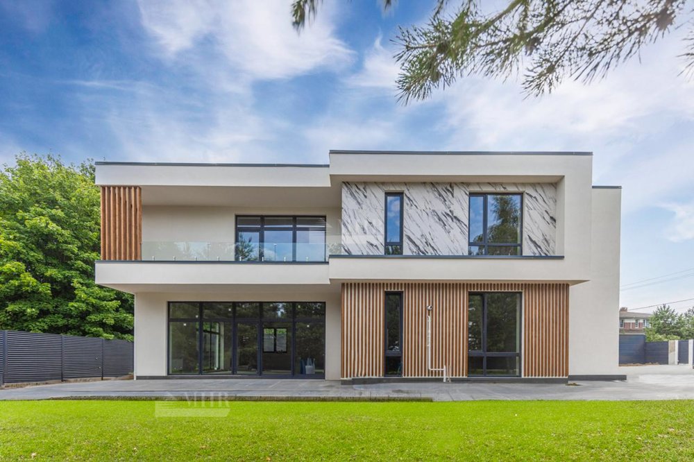 Комбинированная отделка фасада (Штукатурка, широкоформатный керамогранит и лиственница), подчеркивает уникальность данного проекта. Сделано благоустройство территории, установлен забор и автоматические ворота.
