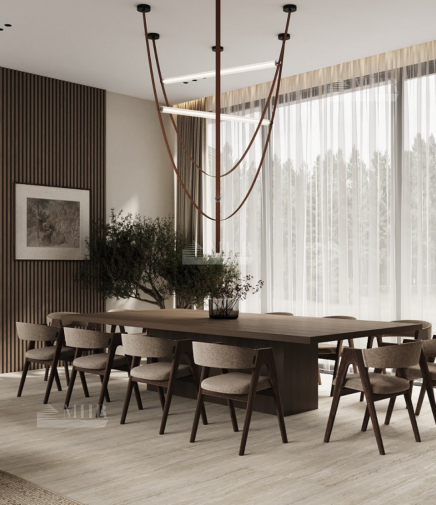 В отделке использовался крупноформатный керамогранит , лиственница и сланец. Панорамное остекление из алюминия Alutech.