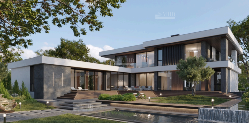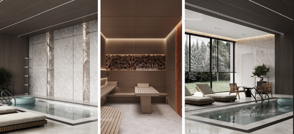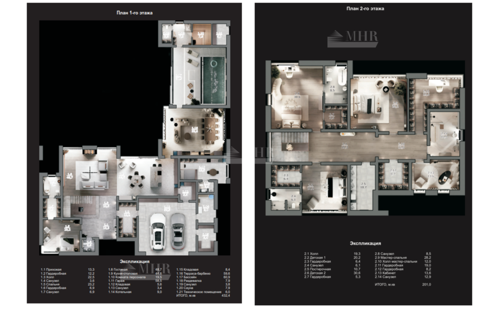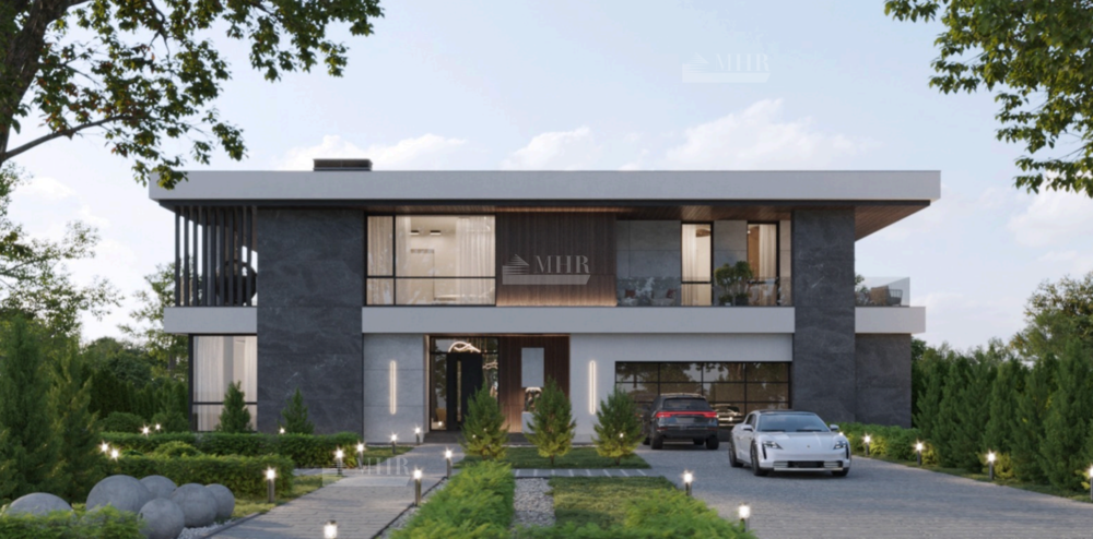 1й этаж: прихожая, гардеробная, холл, 3 с/у, спальня с гардеробной и с/у, гостиная, кухня-столовая, комната персонала, гараж на 2 м/м, кладовая 2 шт., котельная, бассейн, сауна, терраса-барбекю;