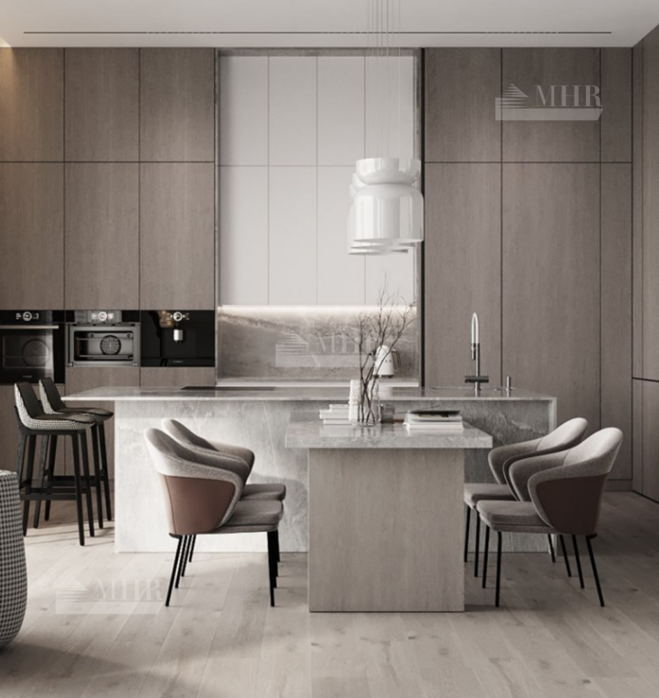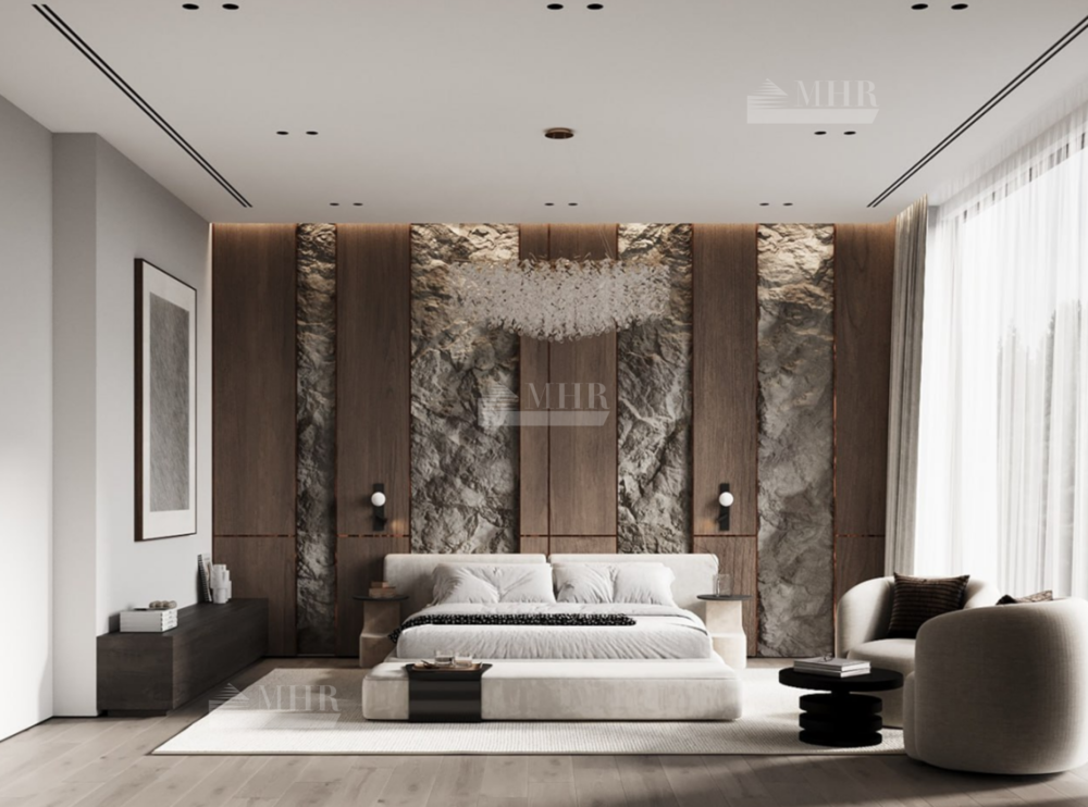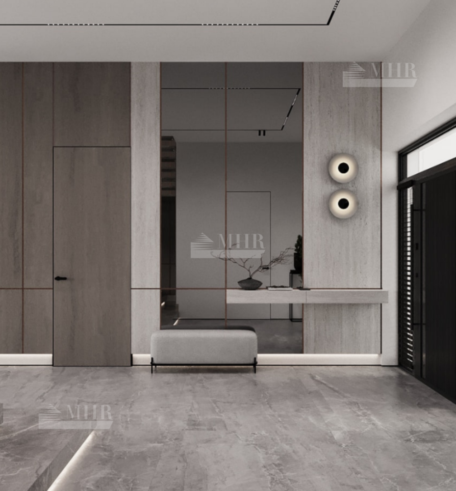 Во внутренней отделке дома использовались: травертин, мрамор, крупноформатный керамогранит(Italon, Atlas Concord, Rex), декоративные панели из дуба, дубовый шпон, декоративная итальянская штукатурка Arreghini, двери скрытого монтажа c алюминиевым профилем.