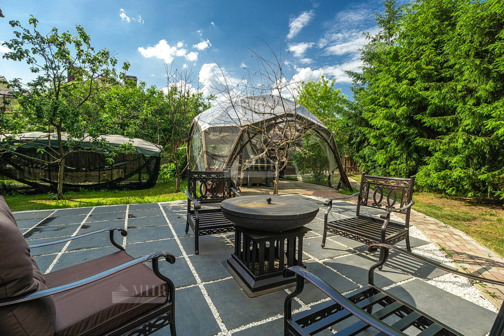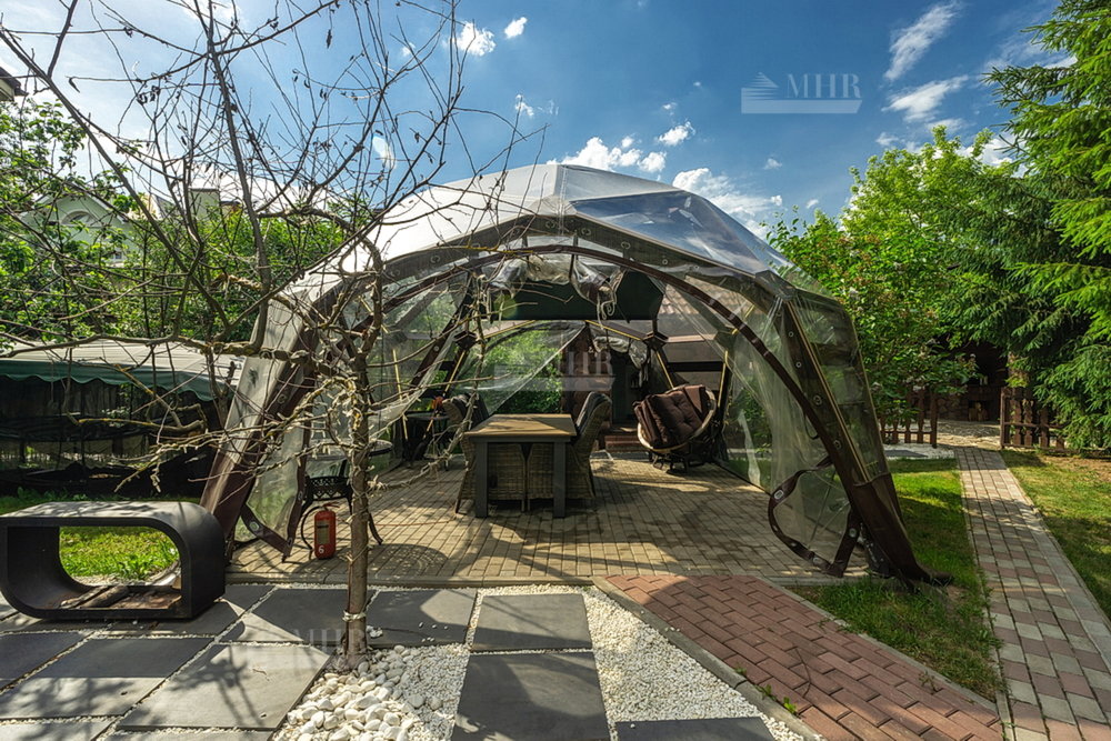 • Зона с дизайнерским шатром. В котором под крышей установлены маркизы для использования в солнечную погоду. В беседку проведено электричество, контурная подсветка и есть несколько розеток. Стоимость беседки составила примерно 2 млн ₽
