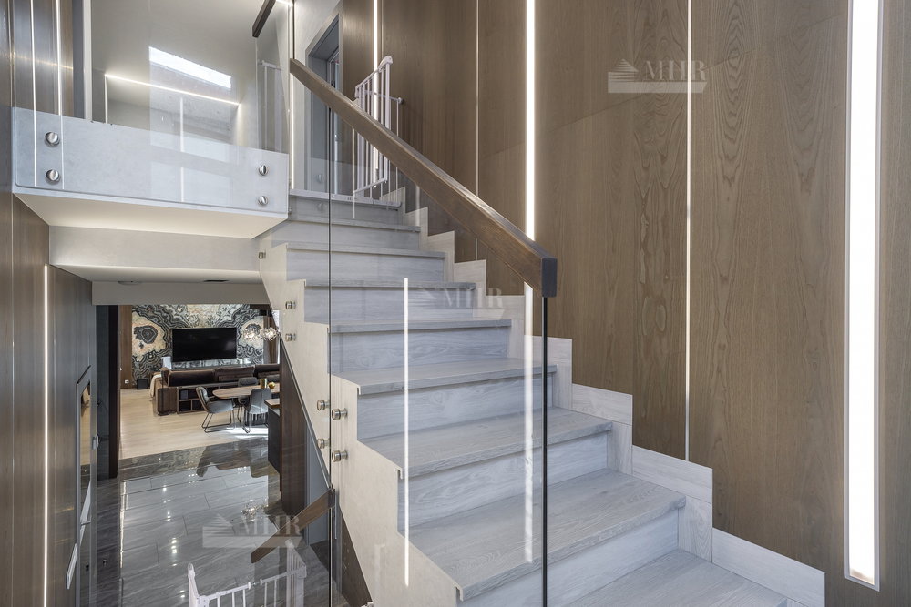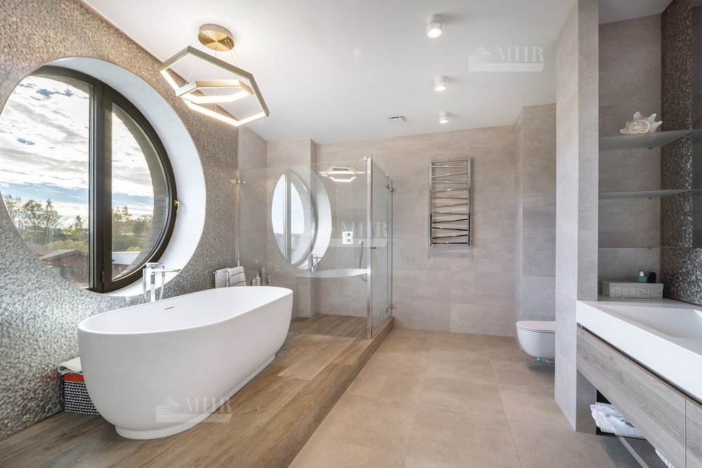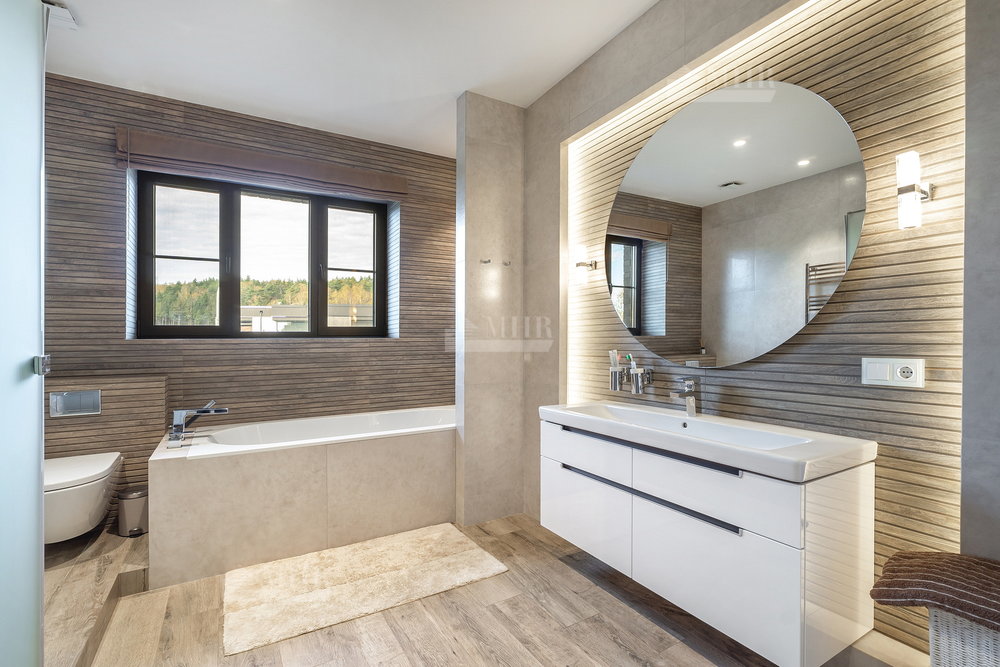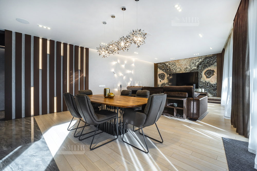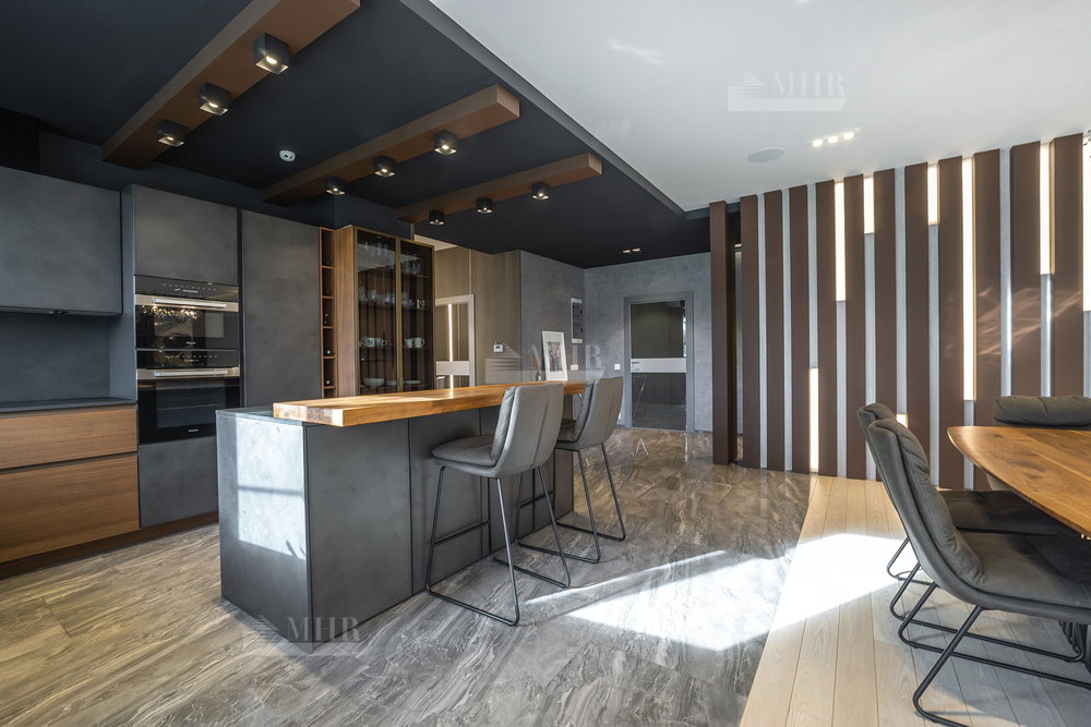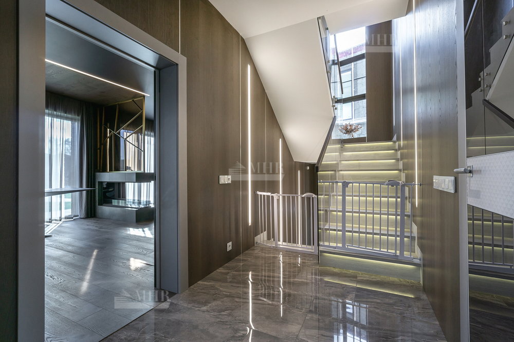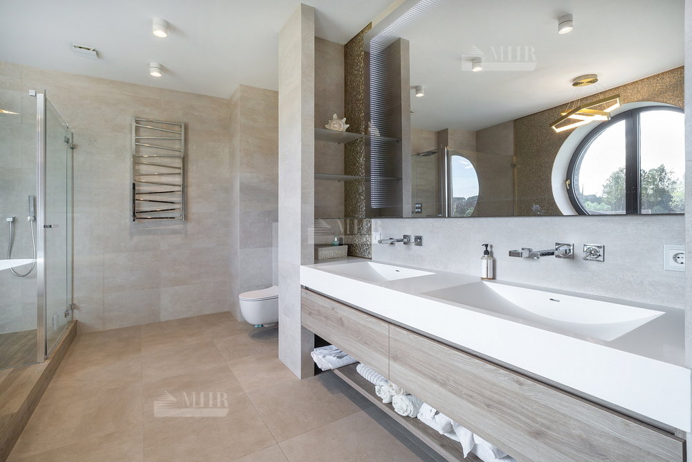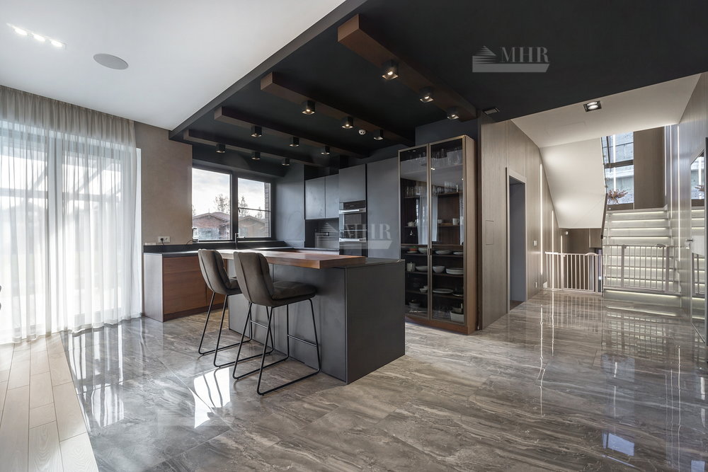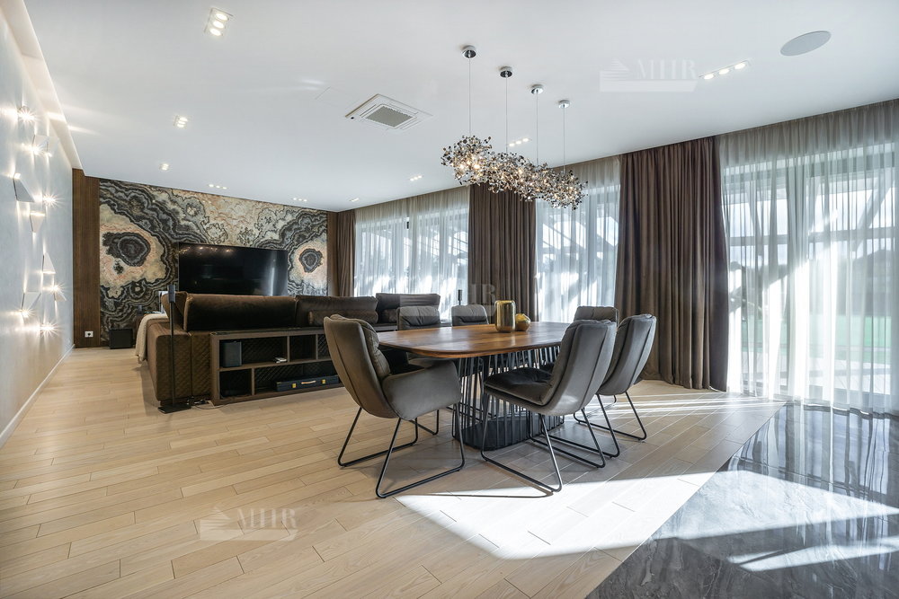 1-й этаж: просторная гостиная и кухня( техника Miele), столовая с выходами на террасу, большой кабинет с камином, входная группа с прихожей/гардеробной, кладовая, санузел, гараж на одну машину с входом в дом;