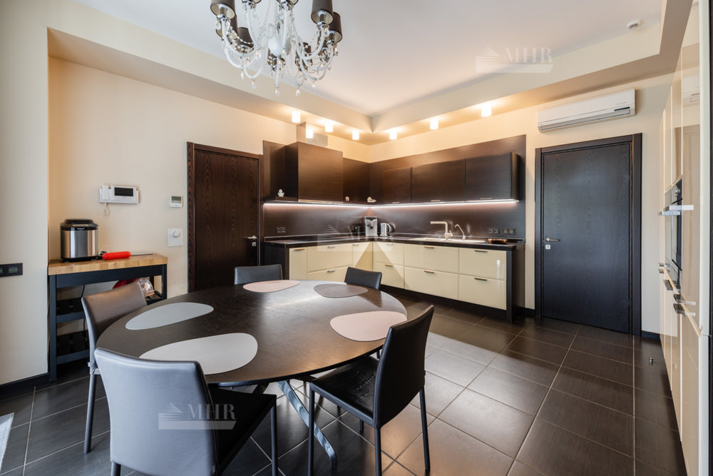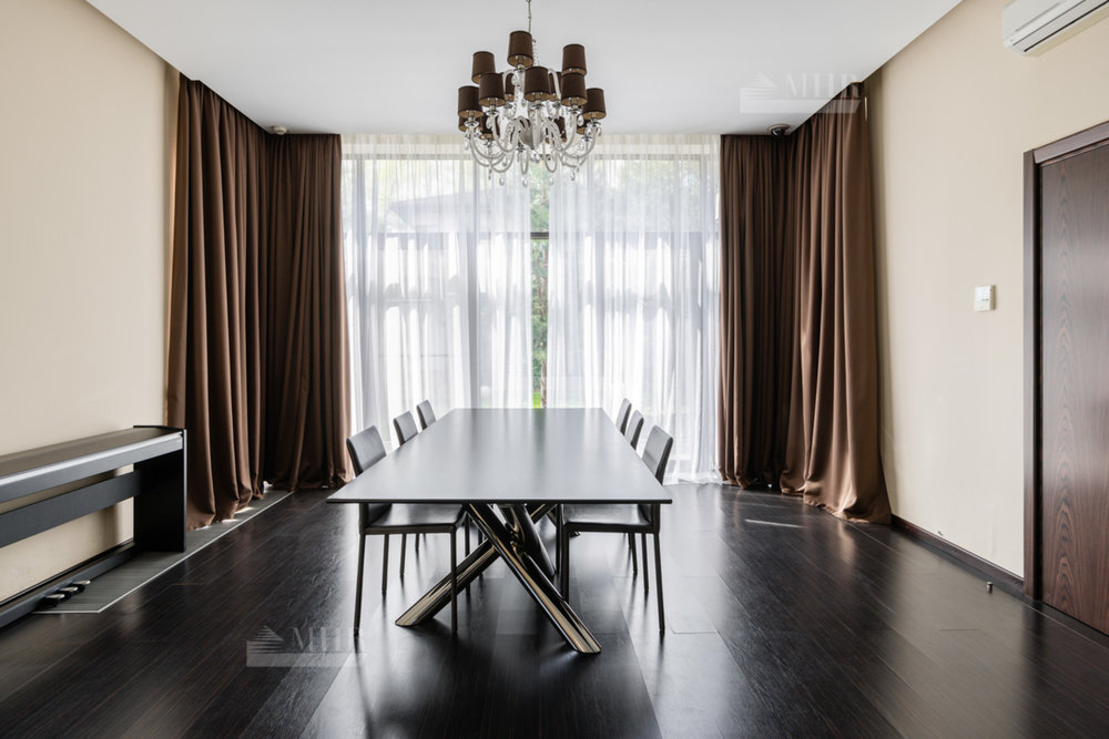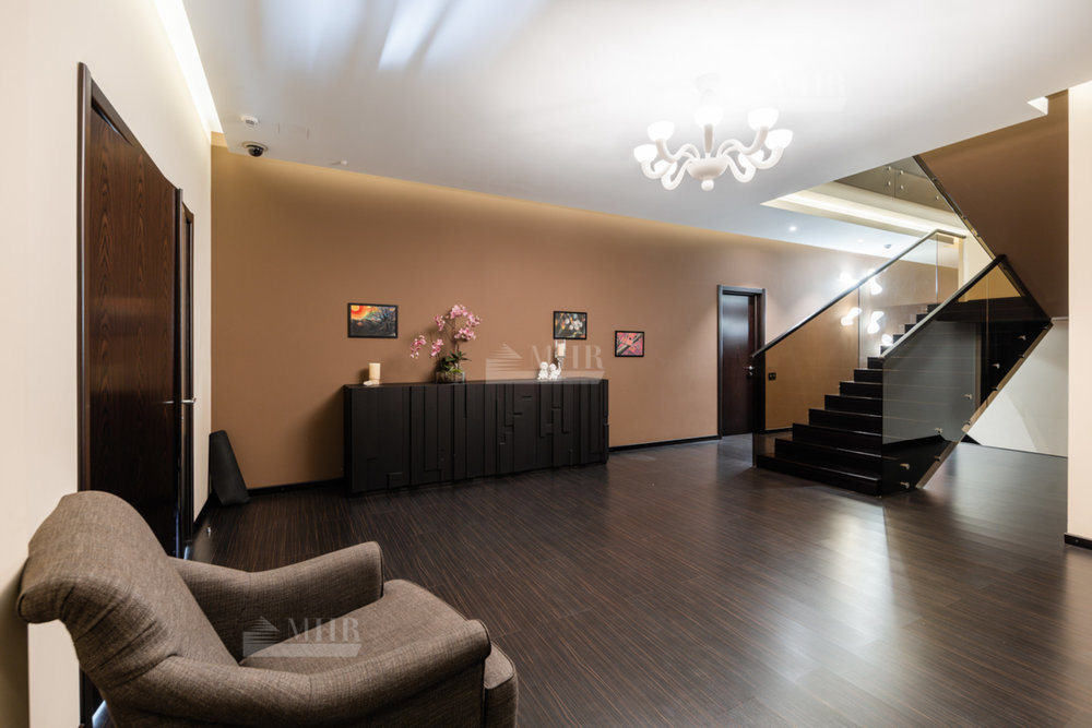 1й этаж: прихожая с гардеробной, лестничный холл с лестницей из дуба, гостиная с панорамными окнами, кухня, столовая, кабинет, гостевая комната, комната отдыха и зона, спа с бассейном и сауной с панорамным видом на участок, гараж на два машиноместа, зона персонала\охраны с собственным санузлом и кухней и отдельным входом;