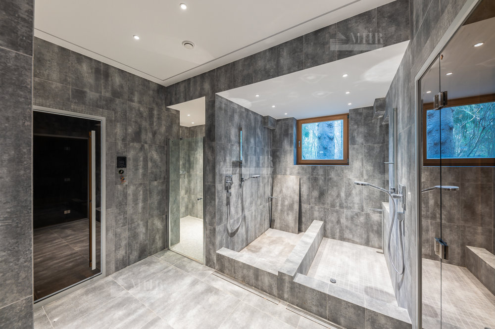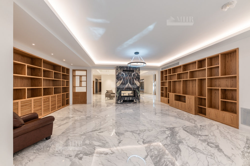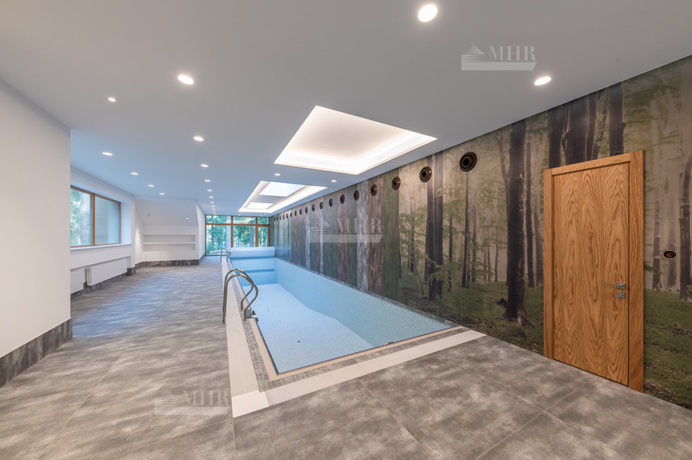 Интерьеры дома выполнены в современном стиле. На первом этаже обустроены помещения для досуга. Это тренажерный зал, бассейн, хаммам, личный кабинет, кухня и санузел. Есть также гараж на два автомобиля для хозяев дома и его гостей.