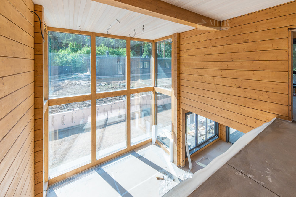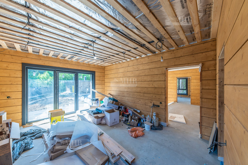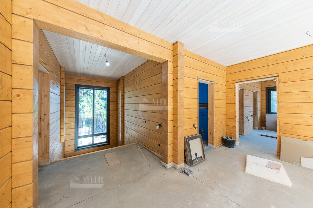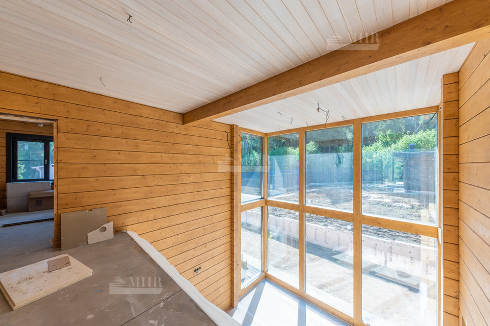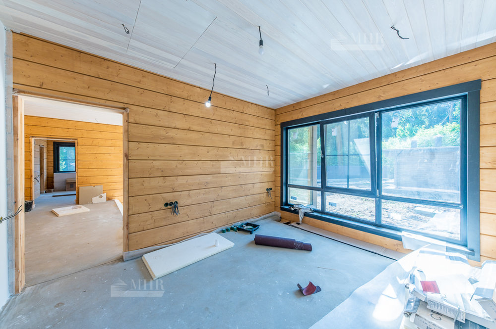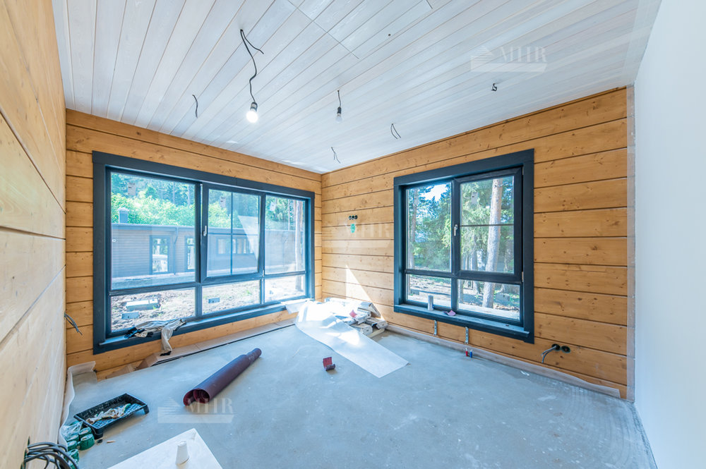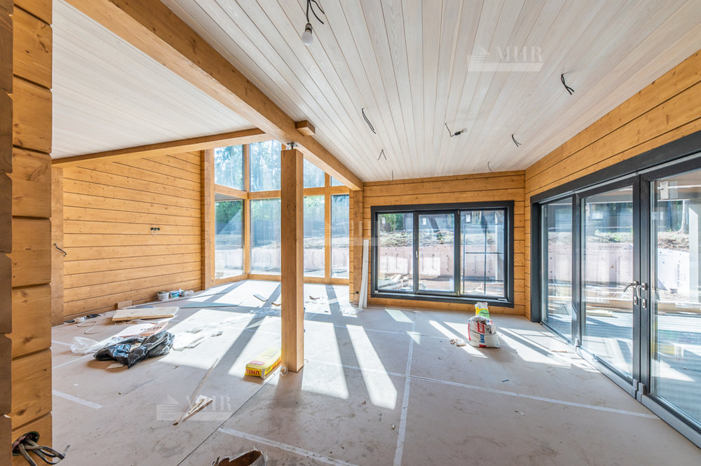 Потолки частично подшиты лиственницей, частично натяжной потолок + установленно всё освещение (по дизайн проекту).