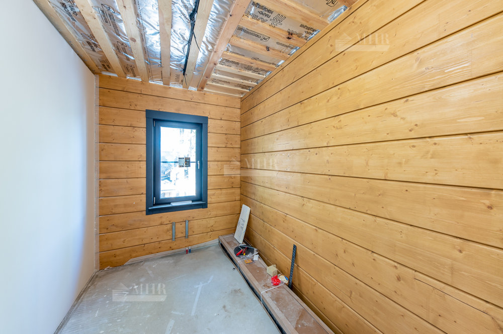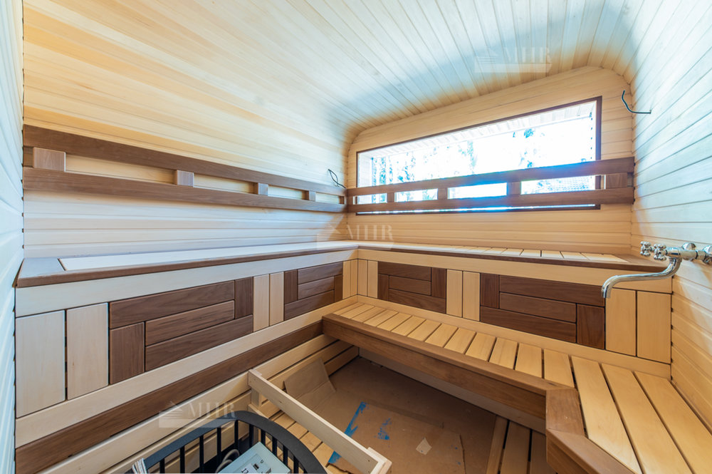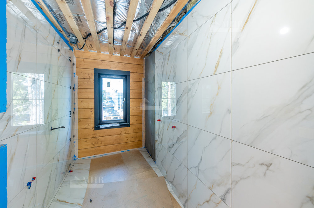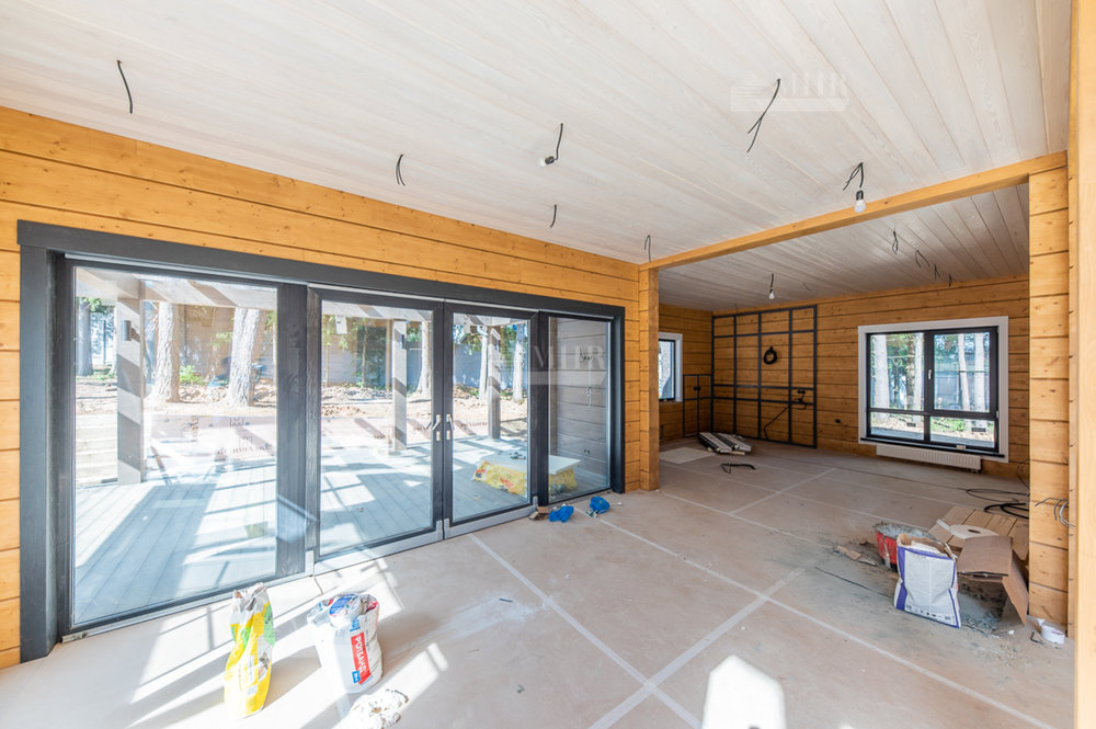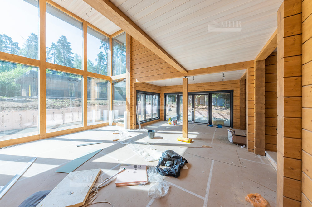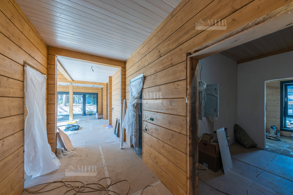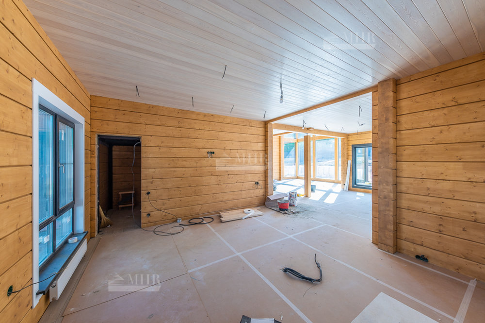 Потолки частично подшиты лиственницей, частично натяжной потолок + установленно всё освещение (по дизайн проекту).
