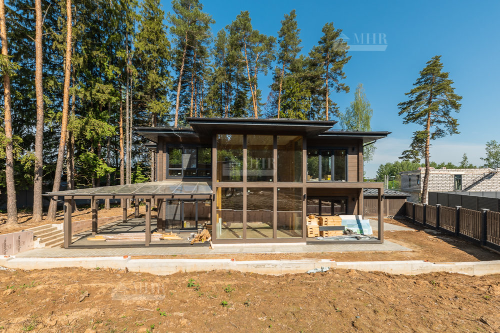 В основе архитектурного решения лежит стиль Прерий. Преобладание горизонтальных линий и простота форм, пологая вальмовая крыша с широкими свесами, массивное остекление окон, прозрачность ограждений и невесомость покрытия террасы, наличие двухсветного пространства и раздвижного портала в гостиной максимально растворяют дом в ландшафте, стирая границы между помещениями и улицей. Цветовая гамма фасадов выполнена в стильном оттенке масла Бариста вкупе с фальцевой кровлей в цвете графит.