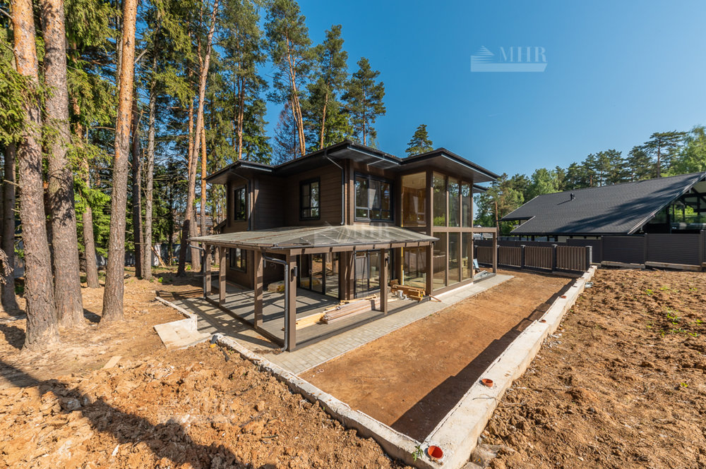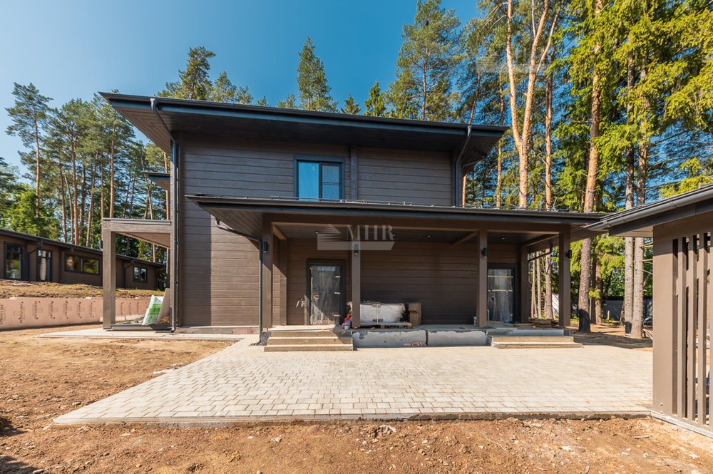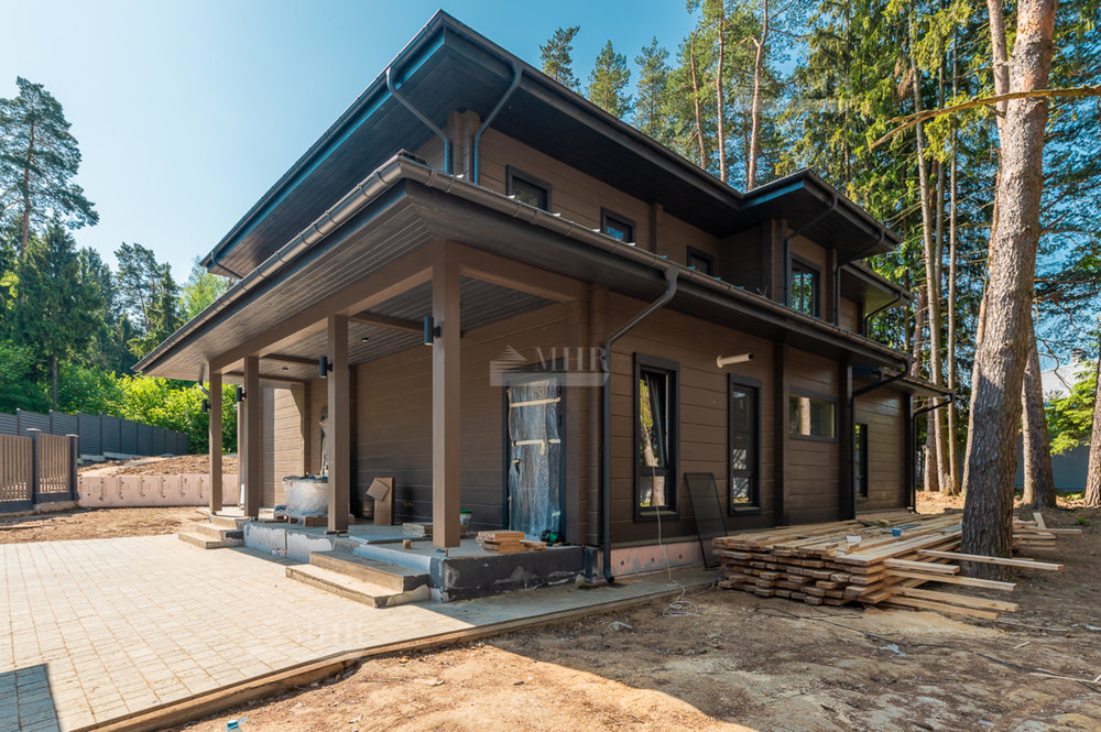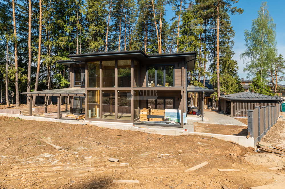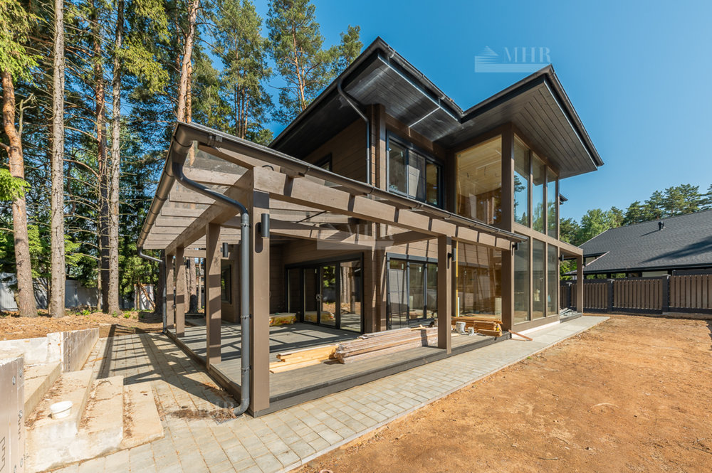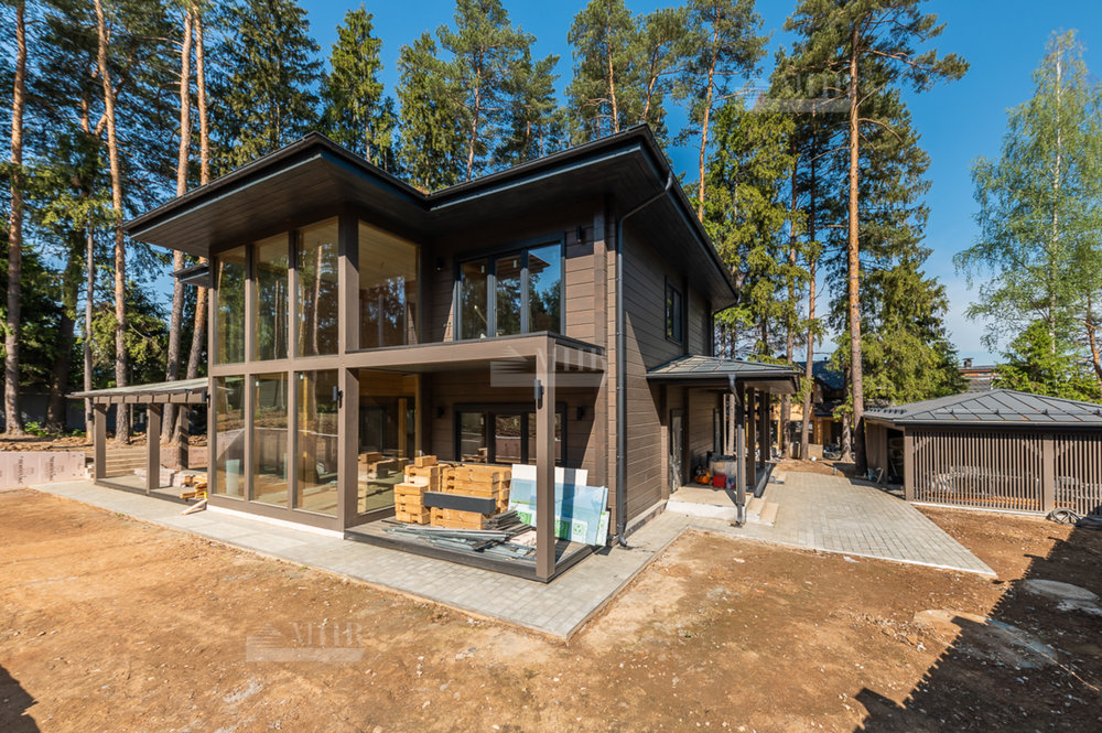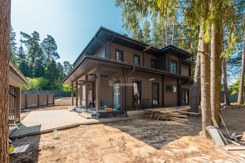 На участке расположен сам дом 307м² и навес, также из клееного бруса, для 2 автомобилей. Большая терраса с уличным освещением. Красивый забор по периметру участка.