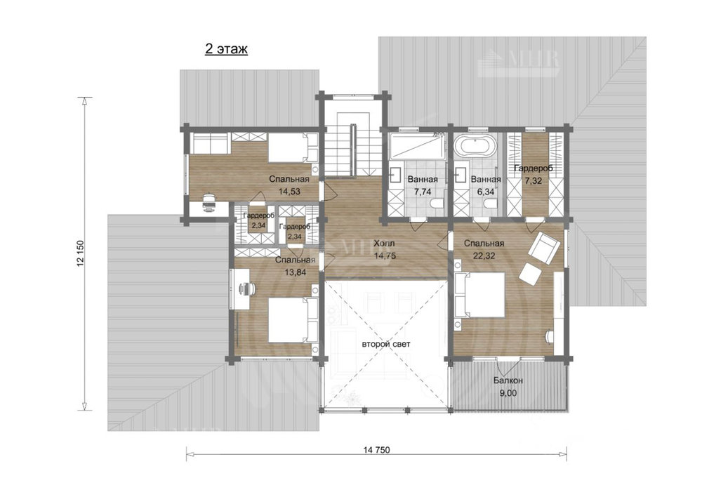 2 этаж: холл (14,75 м²), мастер-спальня (22,32 м²) с ванной (6,34 м²) и гардеробом (7,32 м²) и выходом на балкон (9 м2), детская спальня (14,53 м²) с гардеробом (2,34 м2), спальня (13,64 м²) с гардеробом (2,34 м2), санузел (7,74 м²), второй свет.