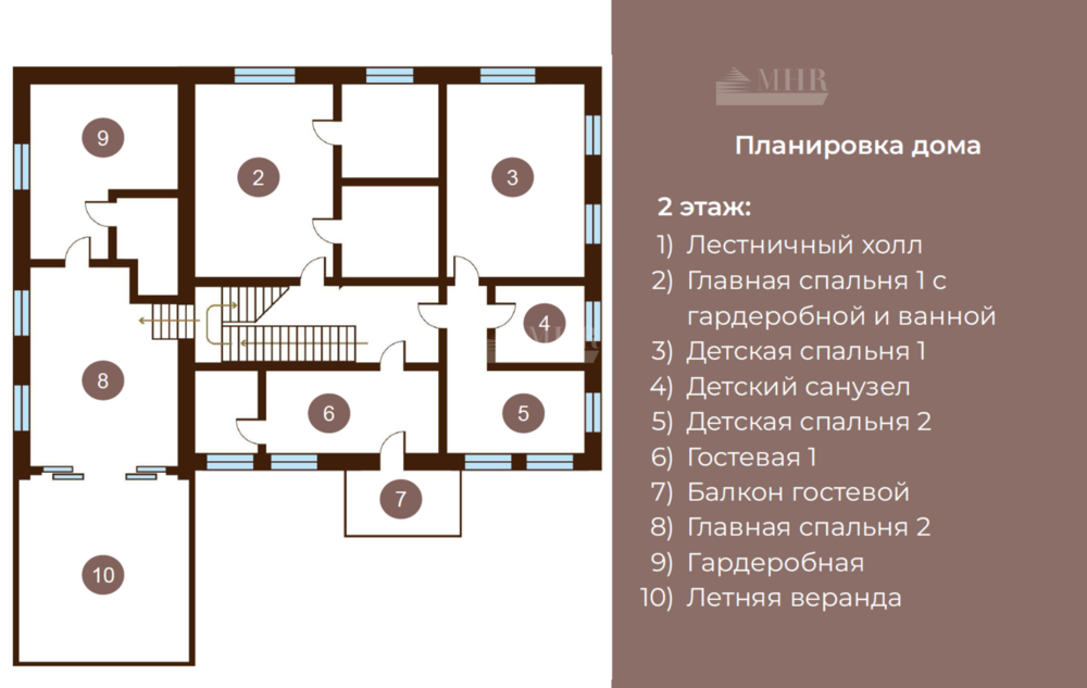 2 этаж: лестничный холл, главная спальня с гардеробной и ванной, детская спальня 1, с/у, детская спальня 2, гостевая 1, балкон гостевой, главная спальня 2, гардеробная, летняя веранда.