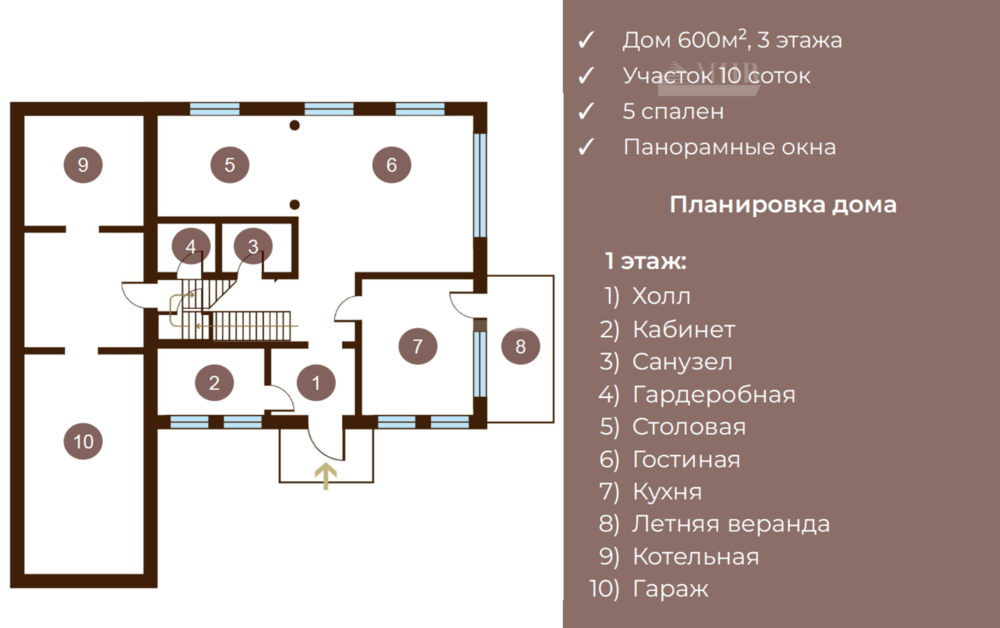 1 этаж: холл, кабинет, с/у, гардеробная, столовая, гостиная, кухня, летняя веранда, котельная, гараж.