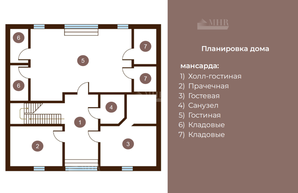 Мансарда: холл-гостиная, прачечная, гостевая спальня, с/у, гостиная, 2 кладовые.