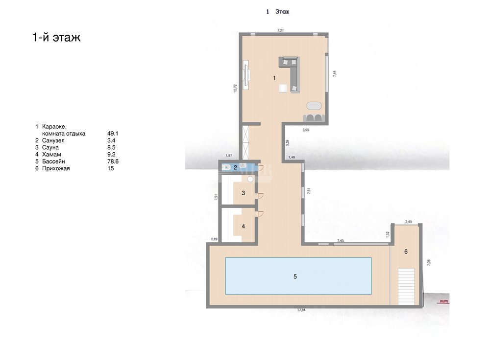 1-й этаж: прихожая, караоке, комната отдыха, с/у, сауна, хаммам, бассейн;