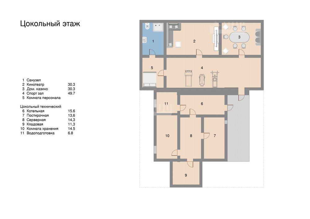 Цокольный этаж: кинотеатр, с/у, домашнее казино, спортивный зал, комната персонала, котельная, постирочная, серверная, кладовая, комната хранения, водоподготовка.