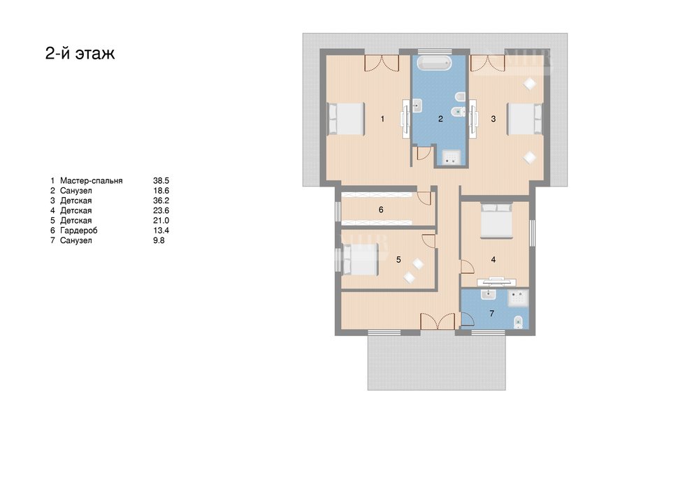 2-й этаж: мастер-спальня, с/у, 3 детские комнаты, гардероб, с/у.
