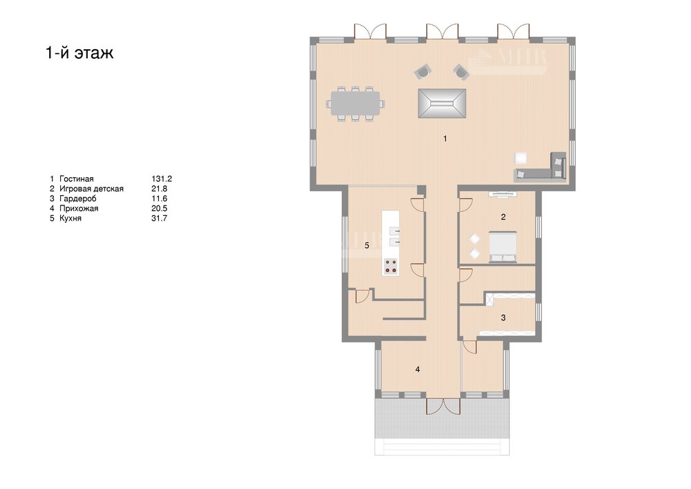 1-й этаж: прихожая, гостиная, кухня, игровая детская, гардеробная;