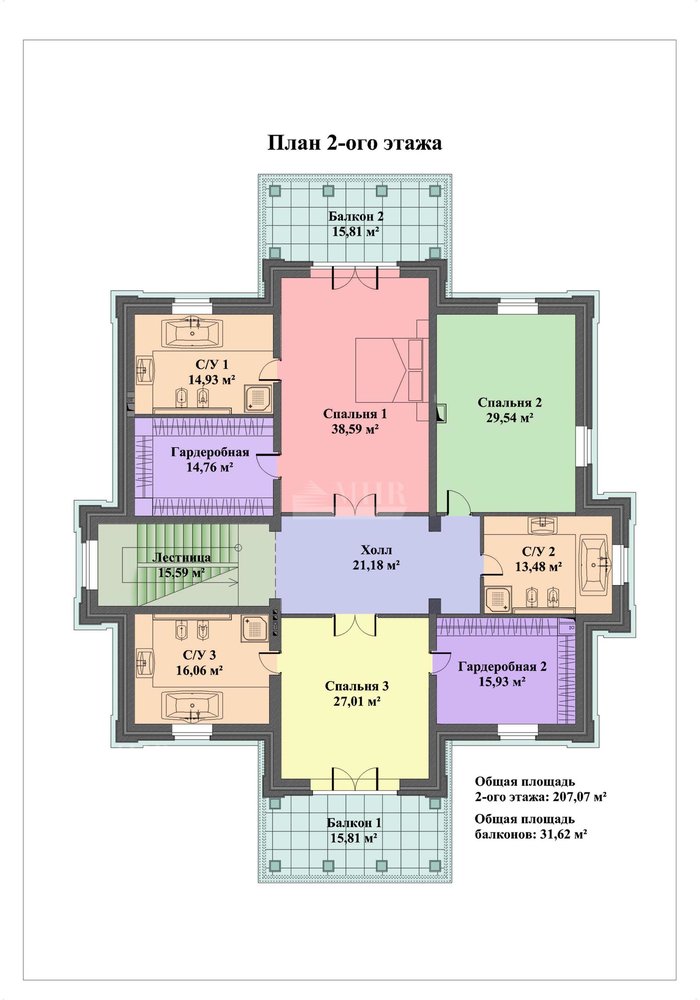 2 этаж: холл, три спальных комнаты с с/у и гардеробными.