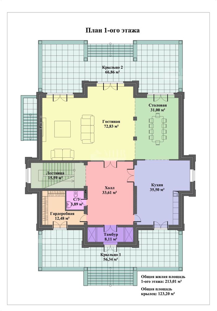 1 этаж: холл, гостиная, кухня, столовая, гардеробная, с/у.