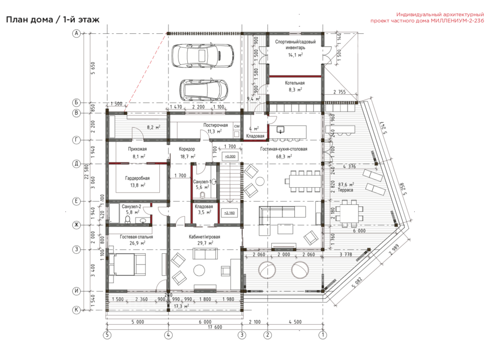 1 этаж: Прихожая, большая гардеробная, гостевой санузел, кухня-столовая, гостиная с выходом на террасу 80м2, кладовая при кухне, постирочная,