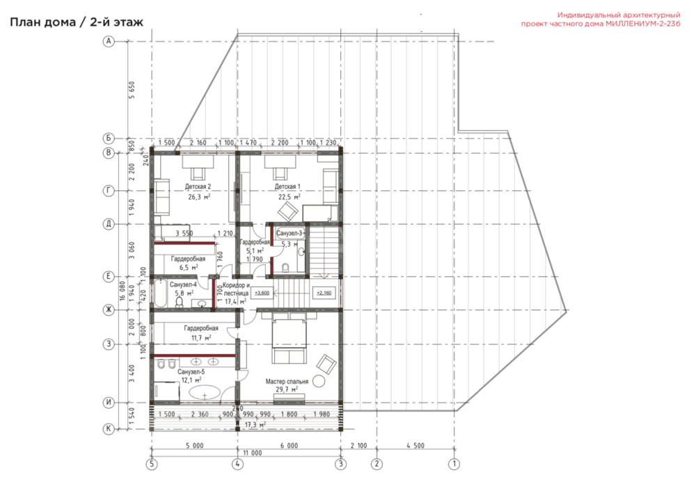 2 этаж: Хозяйская спальня с гардеробной и санузлом, 2 детские спальни с санузлами, холл.