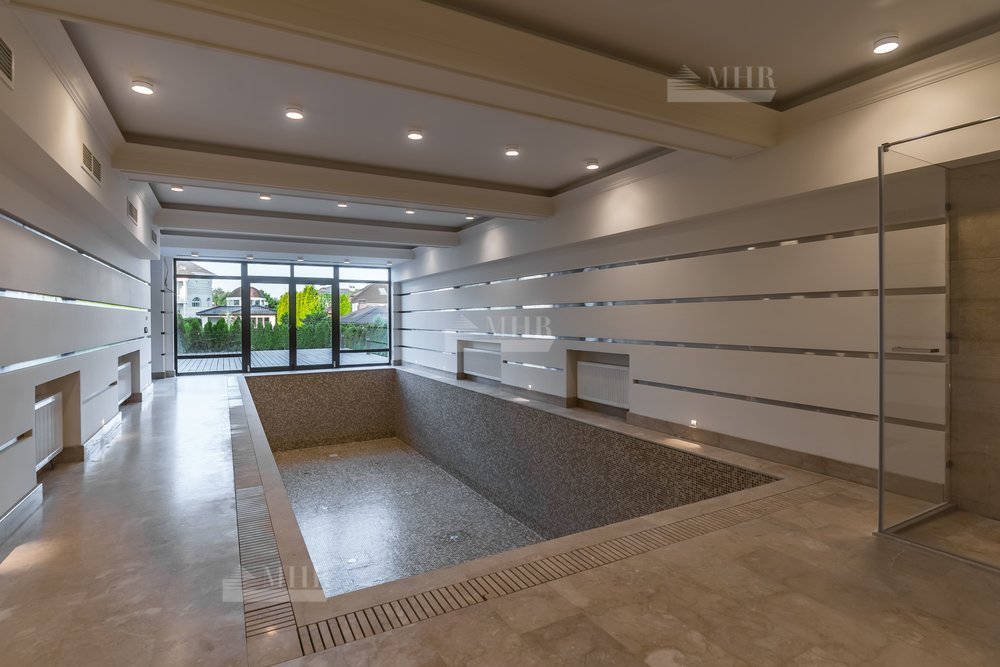 1 этаж - прихожая, гардеробная с с/у, гостевая комната, лестница, помещение под чемоданы, кладовая, кухня-гостиная, центральный зал с камином, кабинет, зимний сад, бассейн с противотоком (3,5 м * 10 м), сауна, с/у, душевая, гараж с выходом в гардеробную.