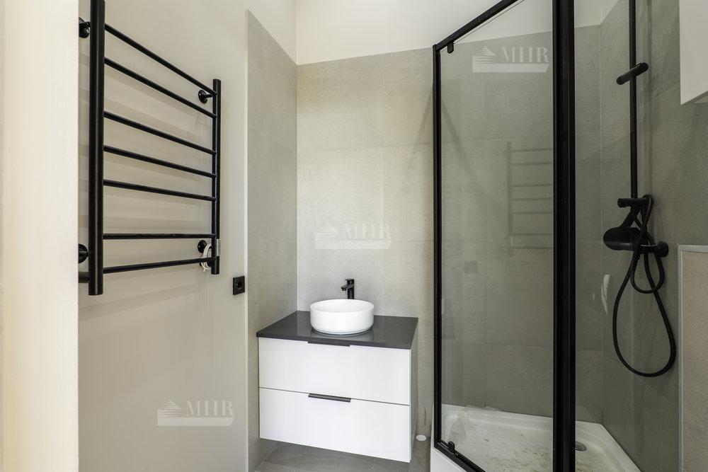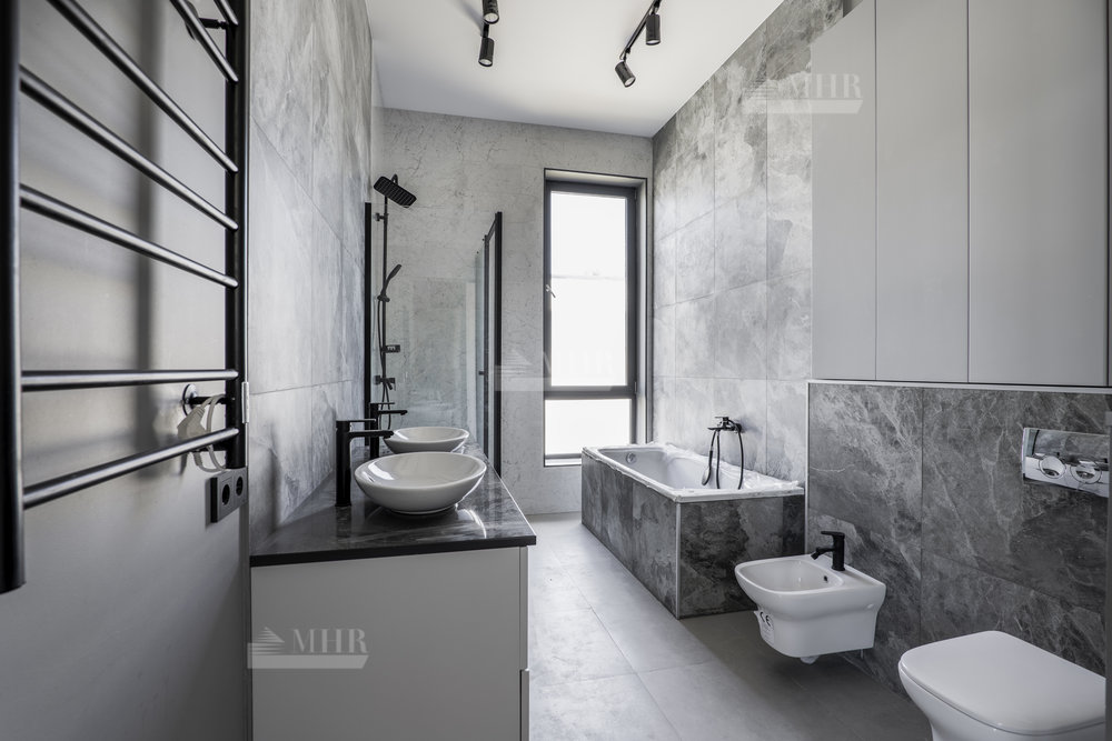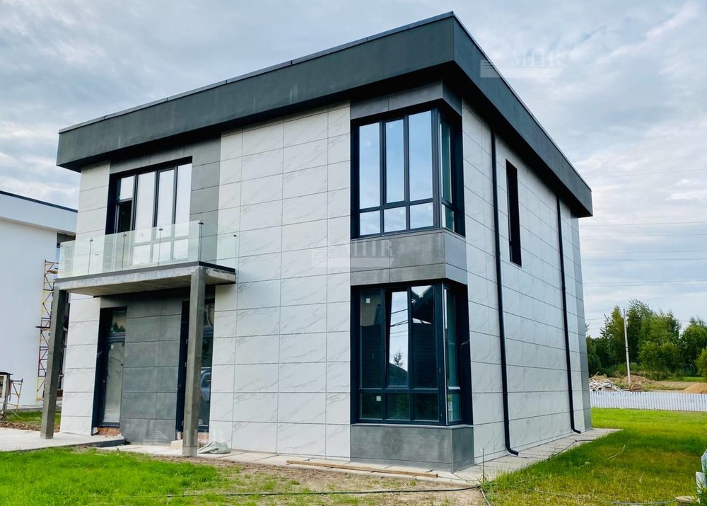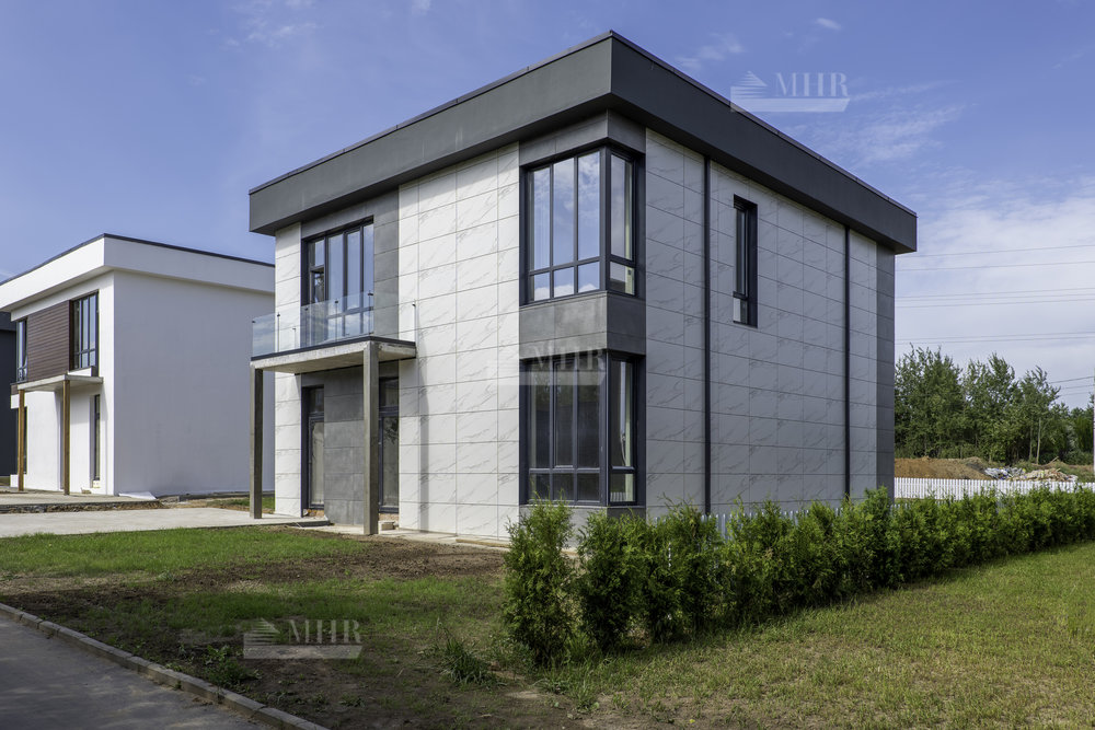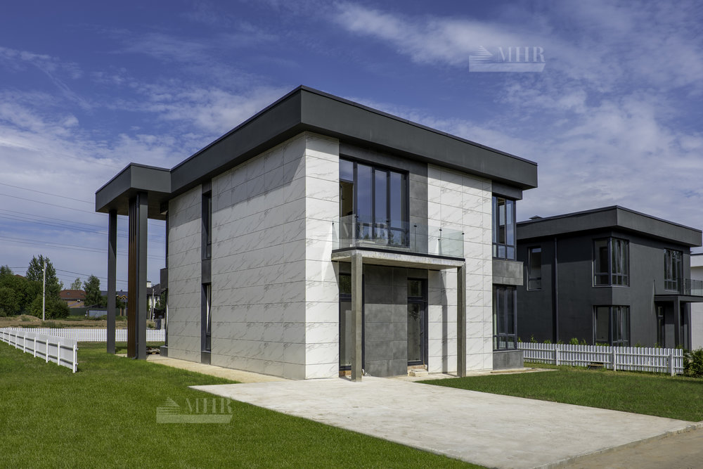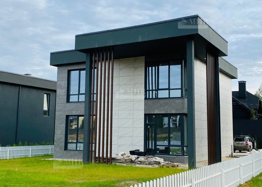 Экстерьер дома выполнен из сочетания керамической плитки в светлых и темных тонах с использованием технологии вентилируемого фасада. В доме выполнена отделка «под ключ» в стиле минимализм в светлых и серых тонах, полностью оборудованы санузлы.
