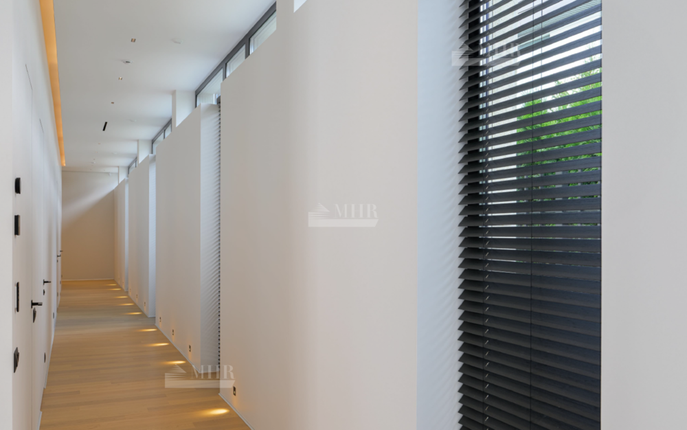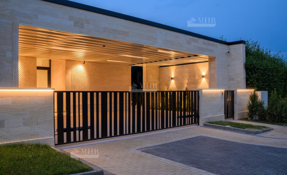Планировка: холл, гардеробная, котельная, прачечная, гостевая спальня-кабинет, с/у, две детские спальни, каждая со своим с/у и гардеробом, хозяйская спальня имеет свой отдельный блок с двумя гардеробными и с/у, рабочая кухня с отдельным входом, просторная светлая гостиная, объединенная с кухней-столовой, большая терраса.