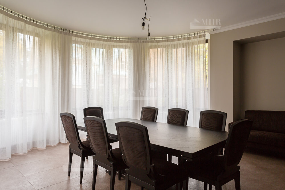1 этаж: гостиная с зоной второго света, кухня, столовая, две гостевые комнаты, санузел, сауна, бойлерная, щитовая, гараж, небольшой подвал на две комнаты.