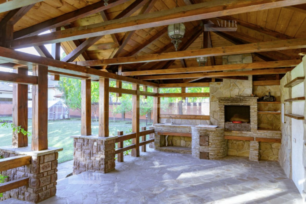 Видеонаблюдение по периметру участка. На участке - беседка, выполнен ландшафтный дизайн, освещение, кустарники. Гараж на 2 м/м+ парковка.