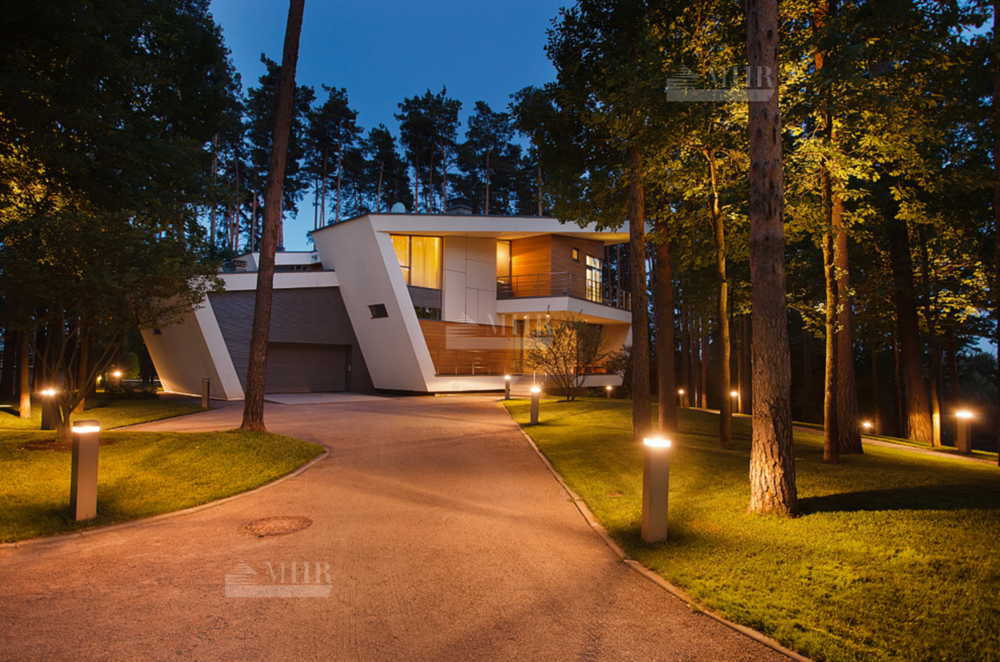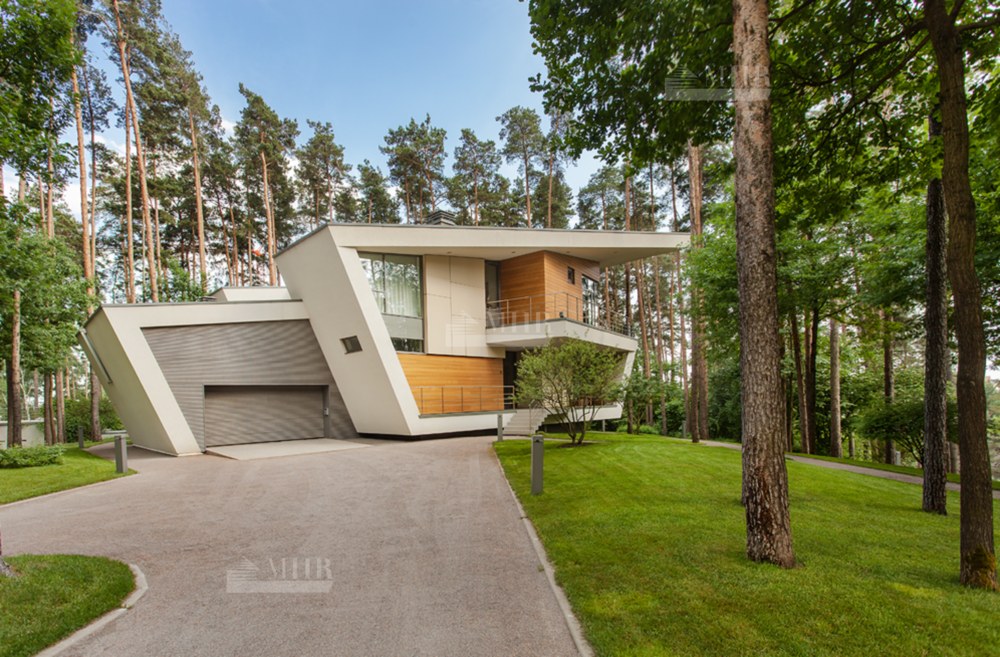 УНИКАЛЬНЫЙ ЭКСТЕРЬЕР ДОМА 640 КВ М. ОБЪЕМ ДОМА ОБРАЗОВАН ОДНОЙ ПЛОСКОСТЬЮ, СЛОЖЕННОЙ В НЕСКОЛЬКО РАЗ ПО ПРИНЦИПУ ОРИГАМИ. ПЛОСКОСТИ ФОРМИРУЮТ МЕЖЭТАЖНЫЕ ПЕРЕКРЫТИЯ, ОБРАЗУЮЩИЕ ТРИ ЭТАЖА ДОМА И ВЫНОСНЫЕ ЭЛЕМЕНТЫ – ЭТО ОТКРЫТЫЕ БАЛКОНЫ И ТЕРРАСЫ, КРОВЛЮ СО СДВИНУТЫМИ КОНСОЛЯМИ, ЧТО ПРИДАЕТ ЭКСТЕРЬЕРУ ДОМА ДЕКОНСТРУКТИВИСТСКИЕ ЧЕРТЫ.