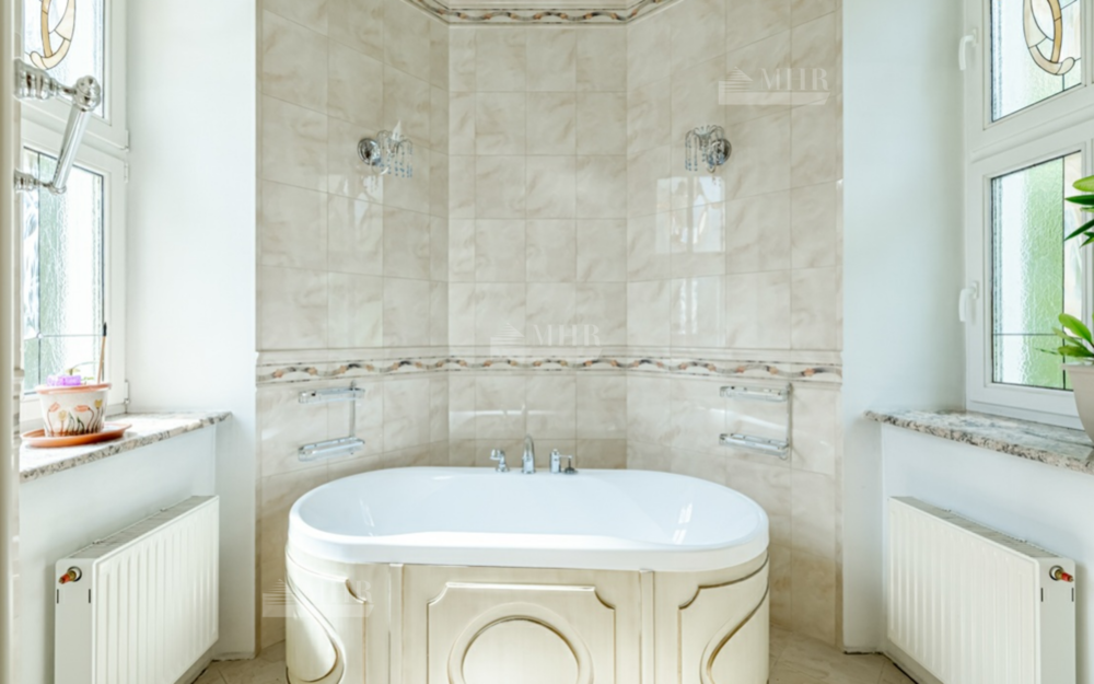 На участке выполнен уникальный парковый ландшафтный дизайн с уютными зонами для отдыха на свежем воздухе. Предусмотрен гараж с блоком для персонала.