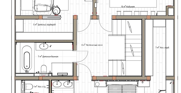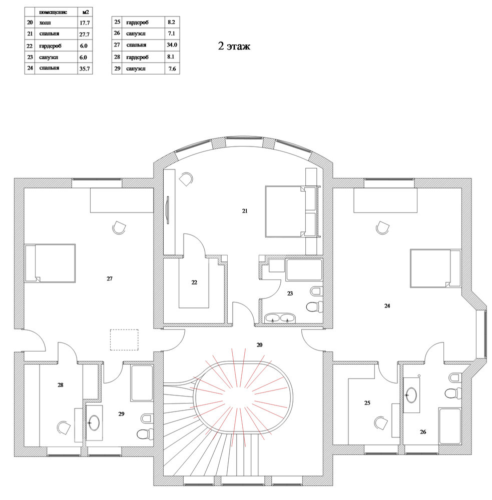 2 этаж: Холл, 3 спальные комнаты со своими ванными комнатами.