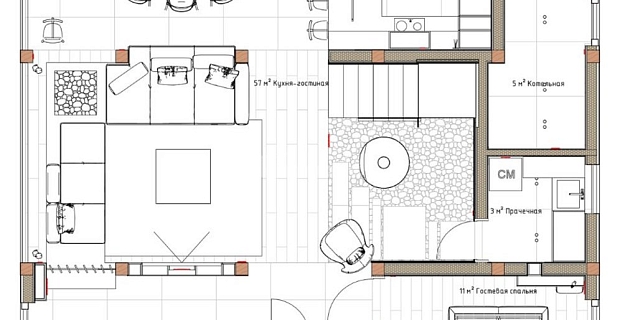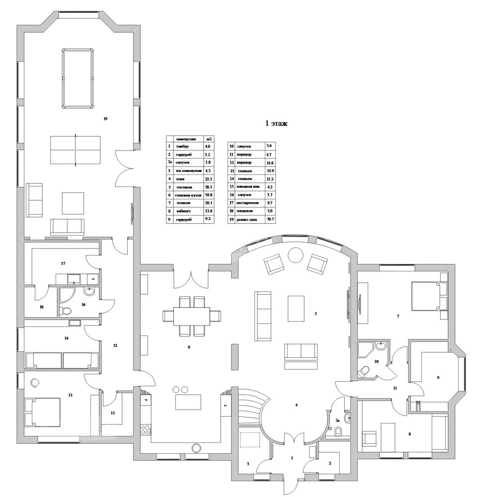 1 этаж: Холл, кухня-столовая, гостиная, кабинет, спальня, с/у, зона relax, спальня, ванная комната, постирочная
