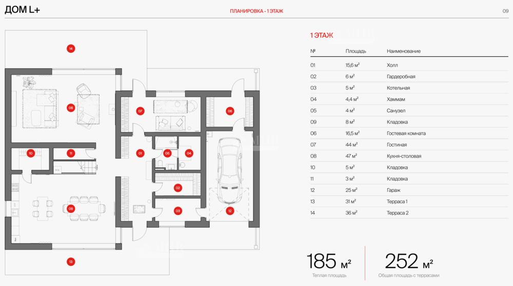1-й этаж: холл, гостиная, столовая,2 кладовки, гостевая спальня, с/у, хаммам, котельная, гараж, 2 терассы;