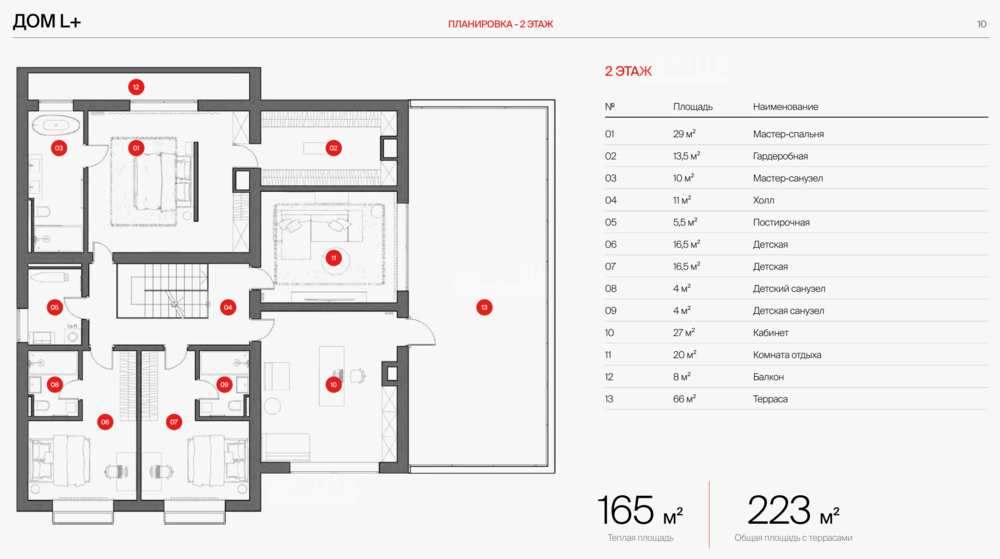 2-й этаж: холл, мастер-спальня, с/у,  2 ванных комнаты, 2 детские комнаты, комната свободного назначения, 2 терассы.