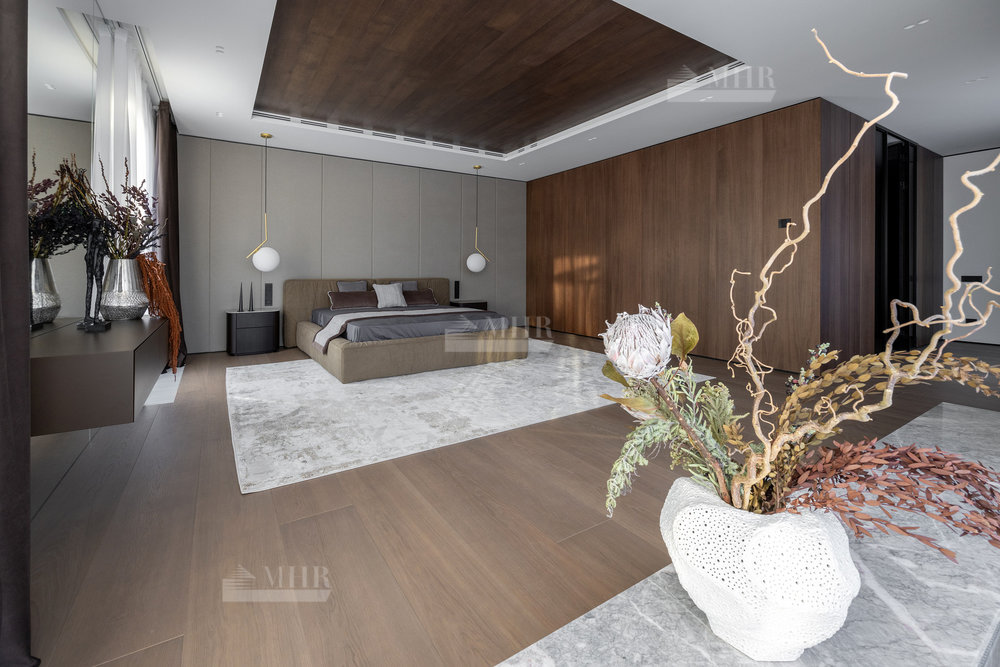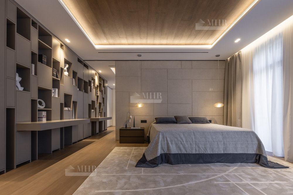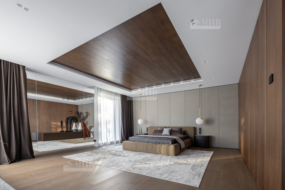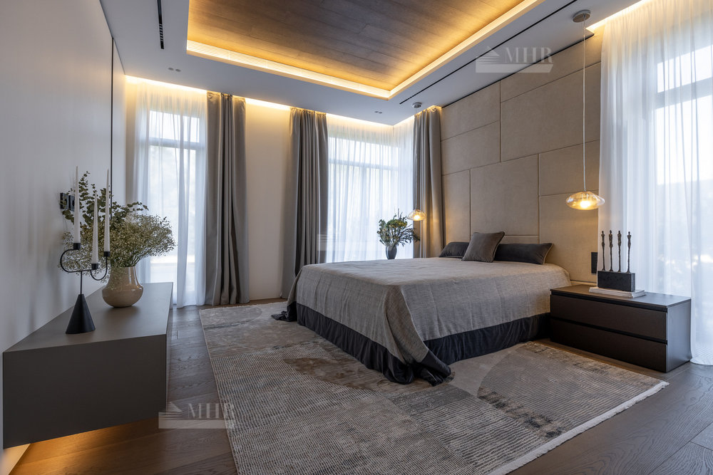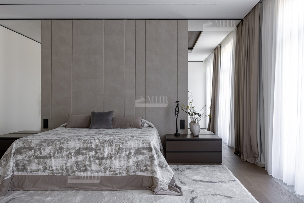 2-й этаж: мастер-спальня с с/у и гардеробной, спальня с с/у-2шт., гардеробная, спальня с гардеробной и санузлом, терраса, блок для персонала.
