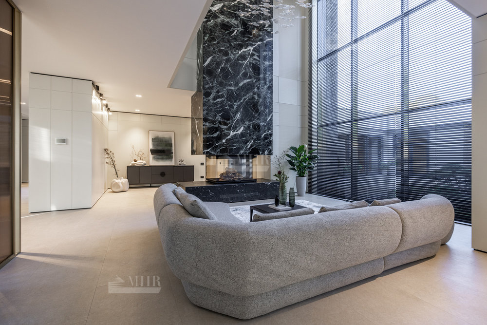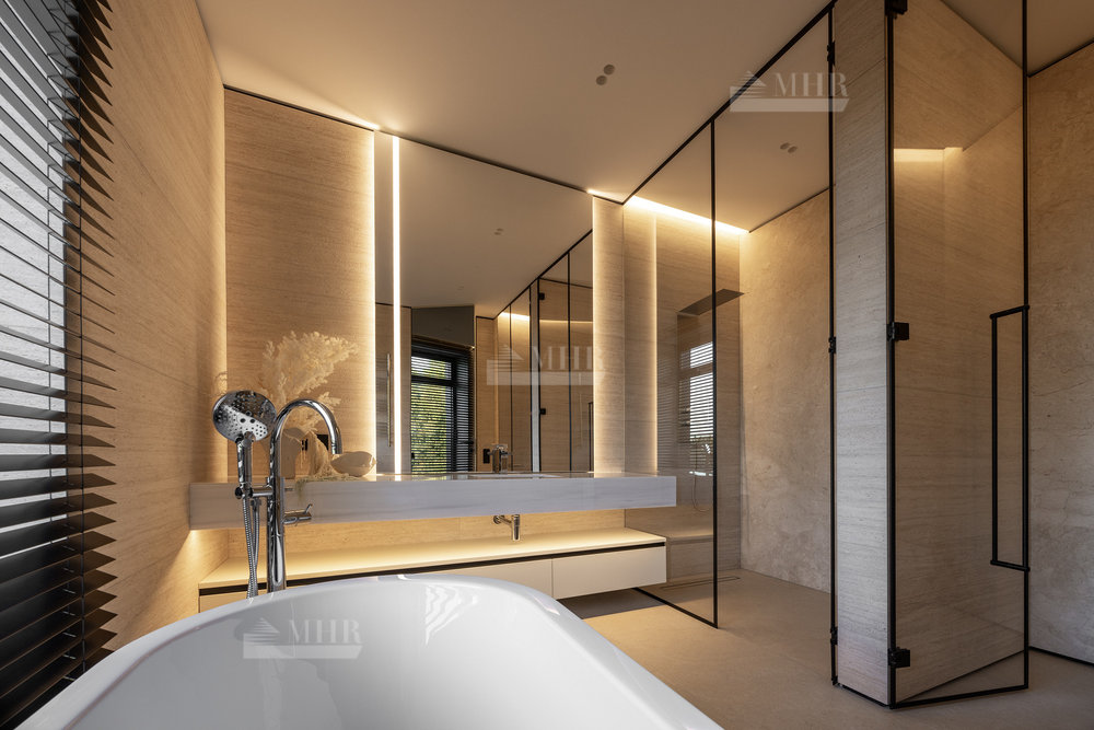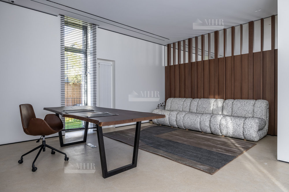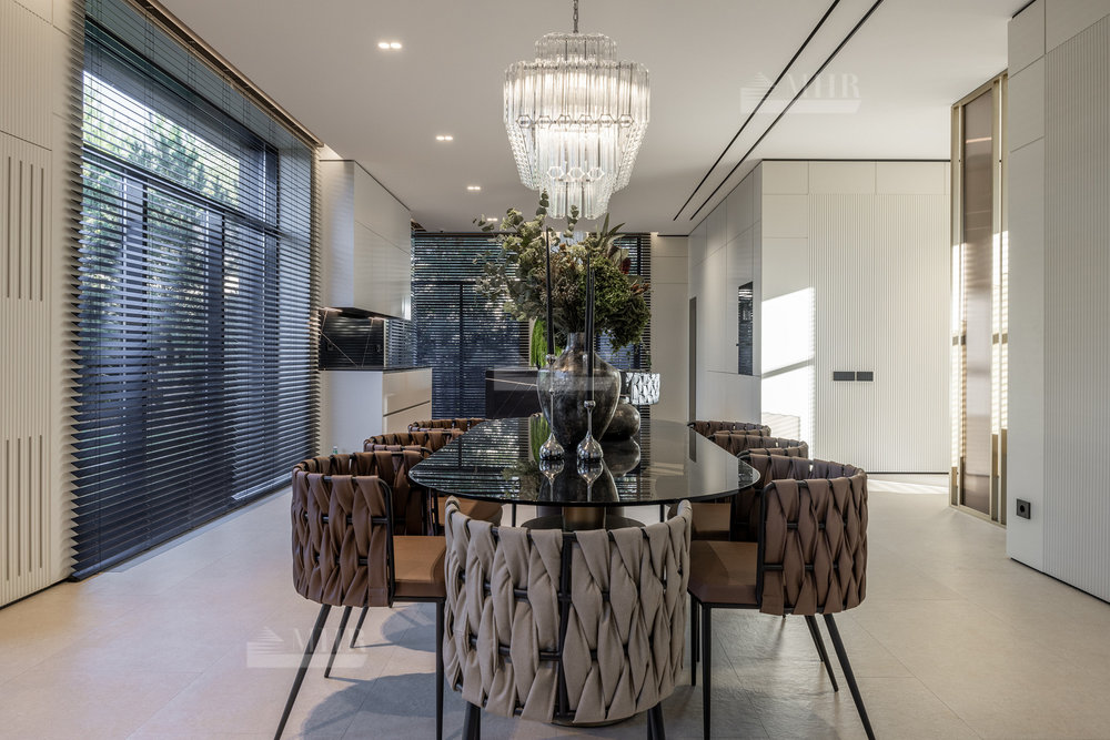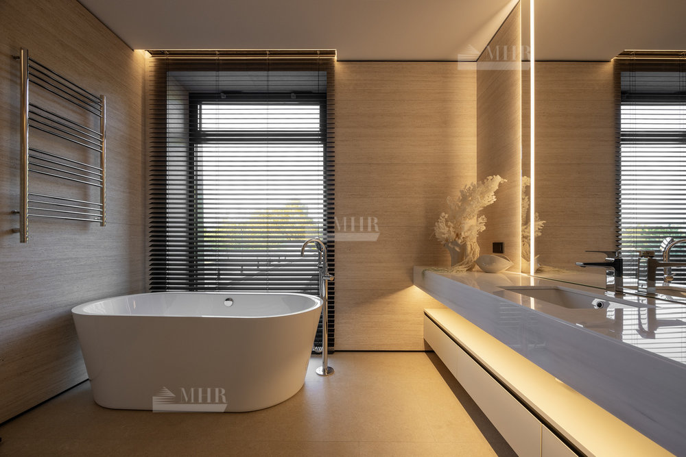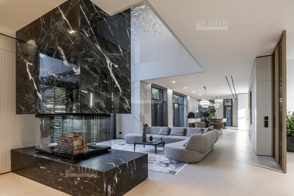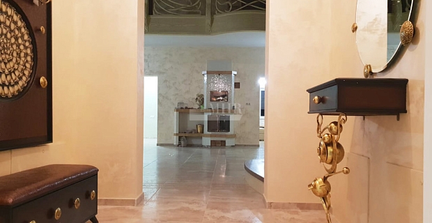 1-й этаж: холл, гостиная со вторым светом, столовая, кухня, кладовая, гардеробная-2 шт., санузел-3 шт., спальня с ванной комнатой, постирочная, кабинет, бассейн, хаммам, купель, сауна, терраса, котельная, гараж.