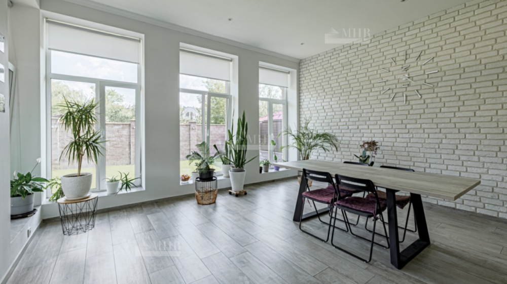 1-й этаж: гостиная-кухня-столовая с камином, застекленная терраса с кухней, спальня, 2 с/у, гардеробная, хоз. комната, теплый гараж на 2 машины;