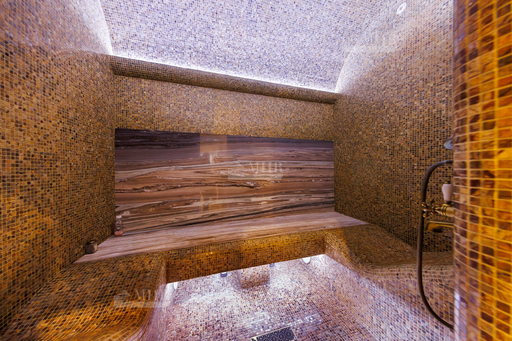 1-й этаж: прихожая, гардеробная, кабинет, гостиная, кухня-столовая, зимний сад с выходом на веранду, с/у, зона СПА( хаммам, бассейн), котельная;