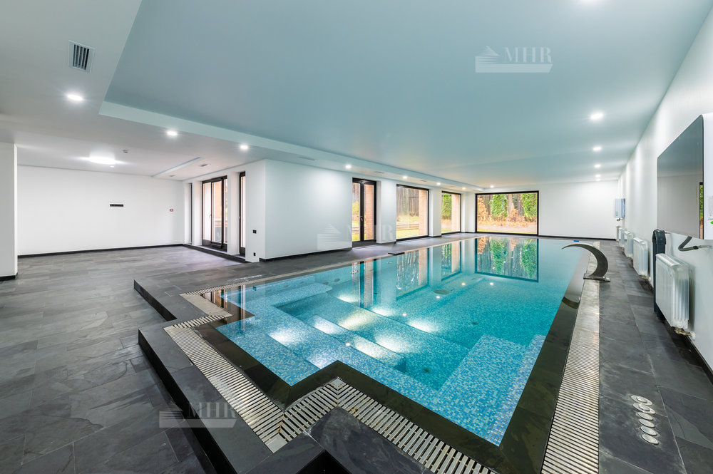 1 этаж: прихожая, холл, гостиная с камином, столовая, зимний сад, кухня-столовая, ванная комната, гардеробная, гостевая спальня, зона отдыха, бассейн, зона SPA, с/у, холл, раздевалка, 2 сауны с душевой, гараж