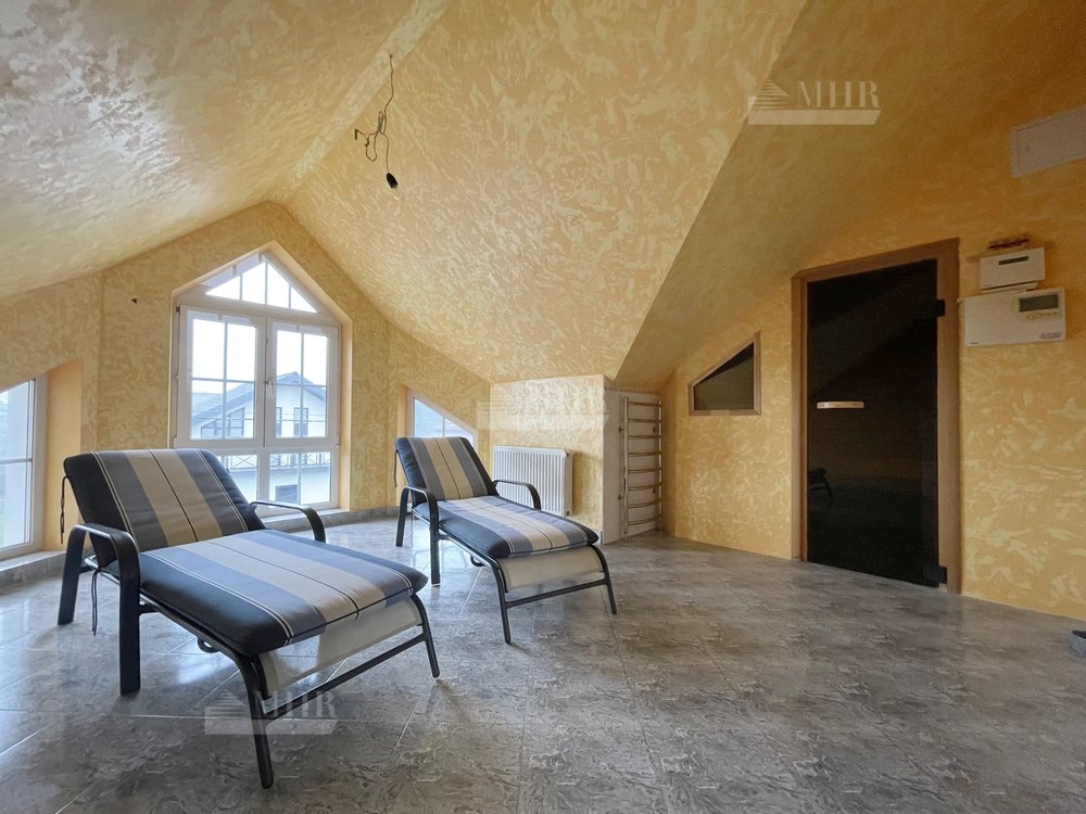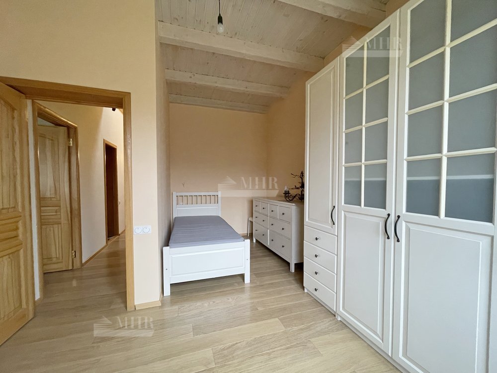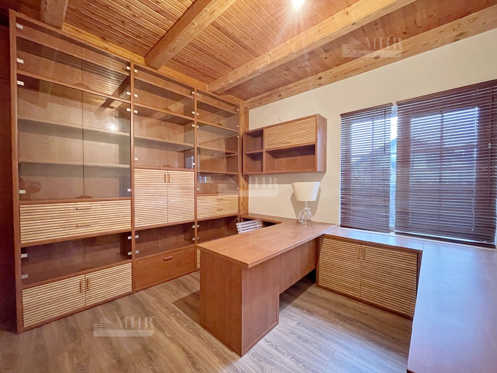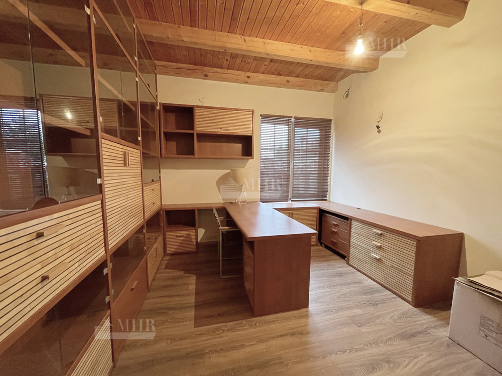 1 этаж: прихожая, гардеробная, гостиная с камином и выходом на террасу, кухня, столовая, кабинет, 2 с/у, 2 гостевые спальни, бойлерная с отдельным  выходом с сад.