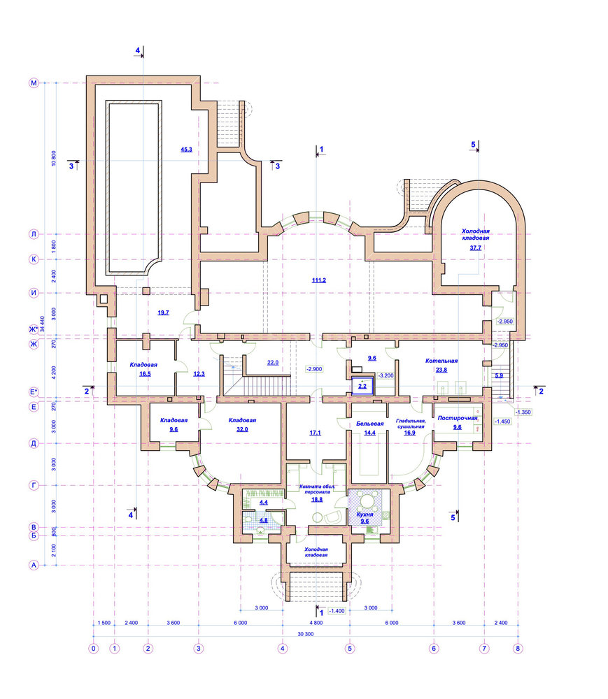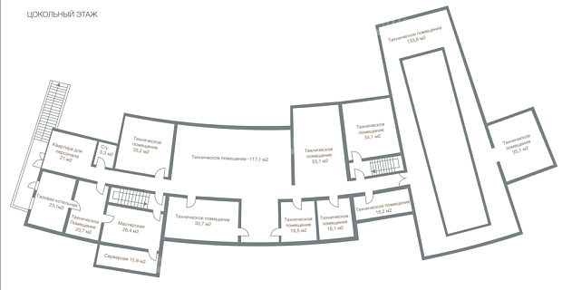 Цоколь - помещение для персонала с кухней, санузлом и гардеробной, котельная, четыре кладовых помещения различного назначения, постирочный блок (бельевая, сушильная, постирочная), большая комната с высокими потолками для кинотеатра или спортзала.