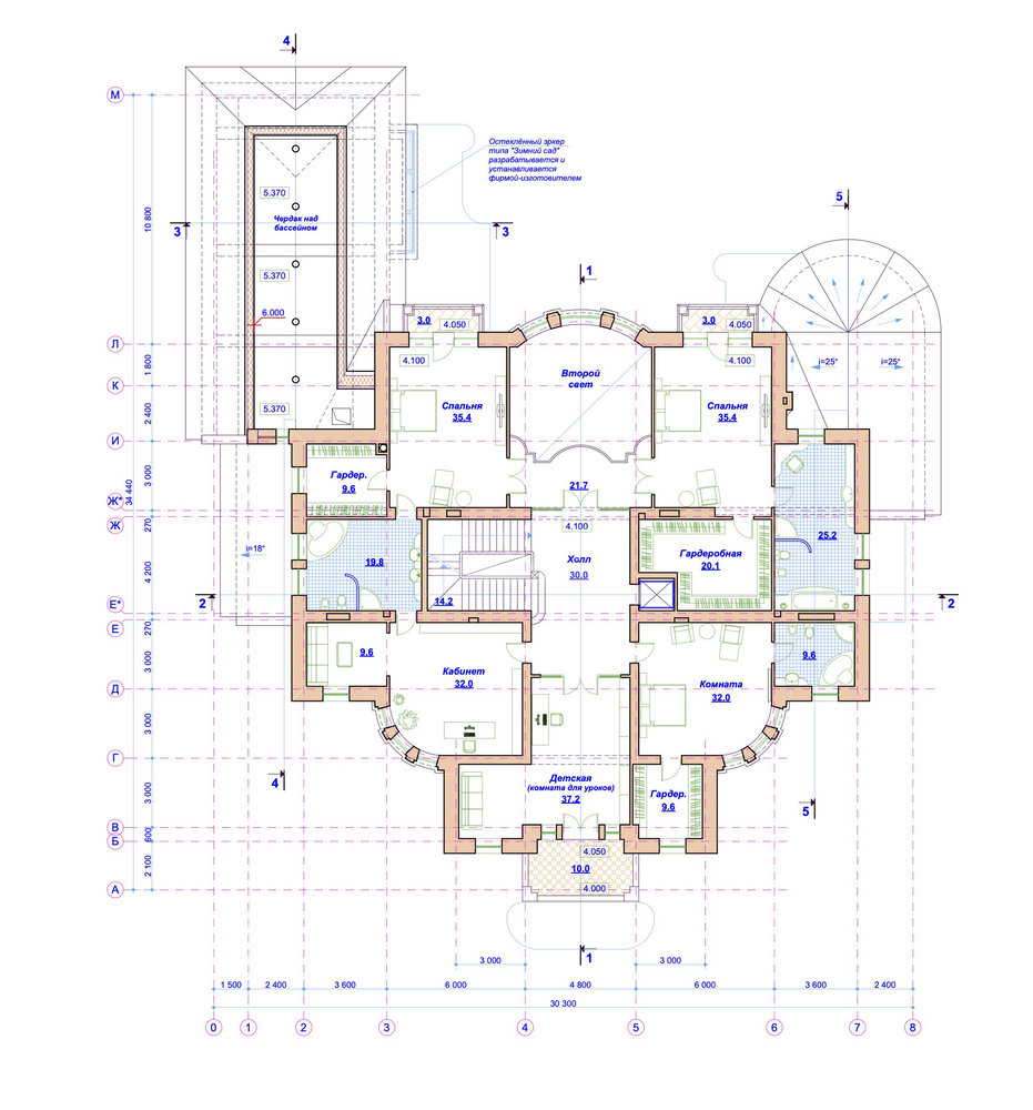 2 этаж - мастер спальня с большой гардеробной и большим санузлом, две спальни/детские с общим санузлом и разными гардеробными,  одна спальня/кабинет с гардеробной и санузлом, детская игровая комната.