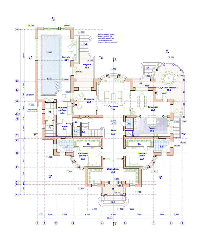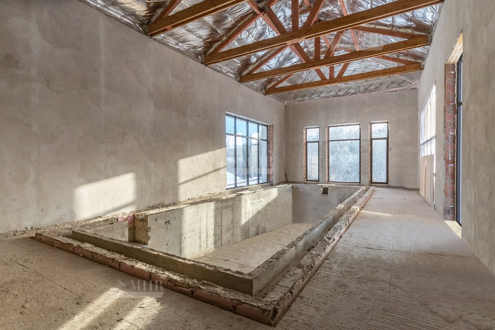 1 этаж - гостевой санузел, две спальни с гардеробными и санузлами, гостиная с вторым светом, столовая с выходом на крытую террасу, кухня, каминная, бассейн с хаммамом и сауной и выход открытую террасу. Предусмотрен лифт с цокольного этажа, до мансарды.