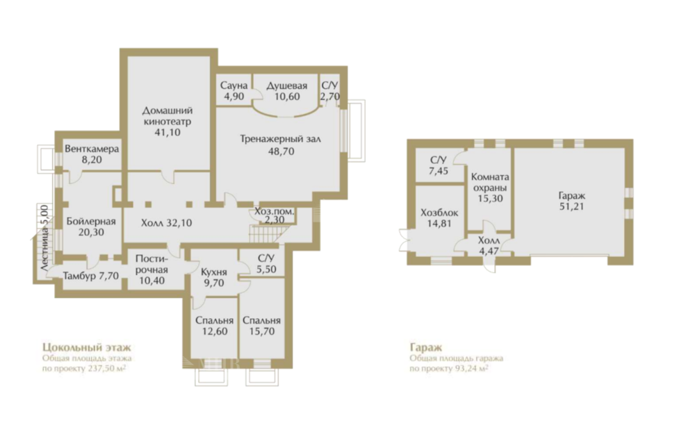 Двухэтажный коттедж с цокольным этажом прямоугольный в плане с выступающими функционально-взаимосвязанными группами, отдельно стоящий гараж.