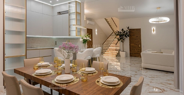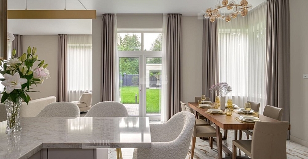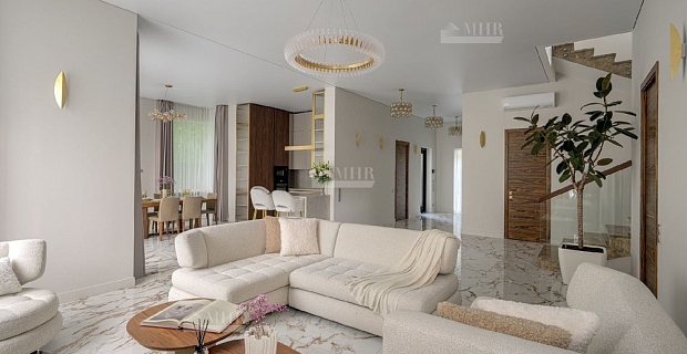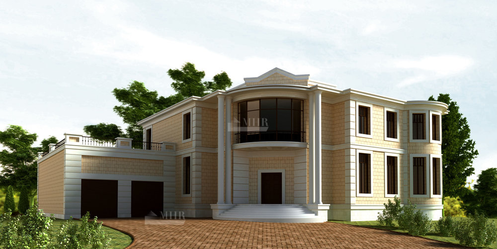 1 этаж: прихожая с прозрачной шахтой лифта, центральный холл с лестницами "дворцового" типа на второй этаж, каминный зал с окнами "второй свет", столовый зал с отделением для курения и выходом во двор на заднюю веранду, кухня, гостиная, гостевой туалет, лестница в цокольный этаж и коридор с выходом в гараж и к бассейну.