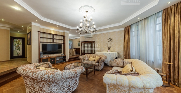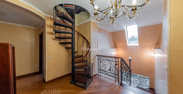 Цоколь: холл, лифтовая дверь, туалет, бильярдная, прачечная, кладовая, кладовая продуктовая с винным отделением, через коридор (отдельно) сауна, с душем и купелью, комната отдыха с камином (теплый пол) и тренажерным отделением, туалет. Коридор с проходом к котельной и помещению под бассейном, туалет. Кроме этого, 2-х комнатная квартира для прислуги с отдельным входом со двора, но с возможностью попадания в дом через котельную.