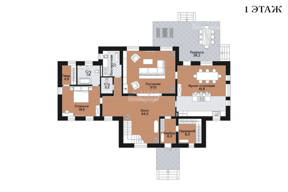 1й этаж: холл, 2 гардероба, 2 с/у, постирочная, кухня-столовая, гостиная, спальня, терраса;