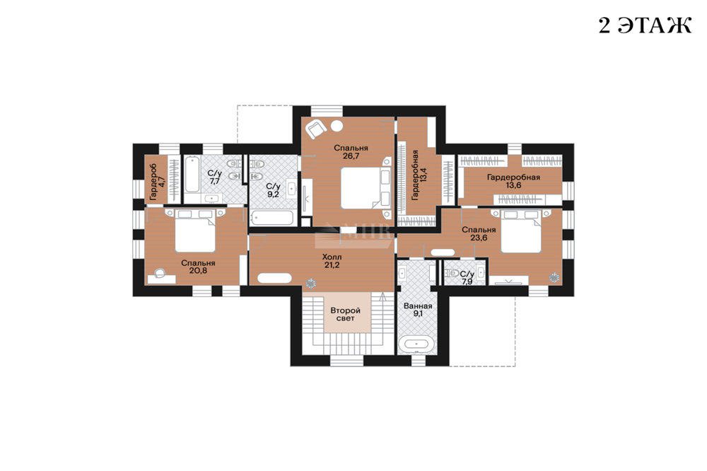 2й этаж: 3 с/у с ванной, 3 спальных комнаты, 3 гардероба.