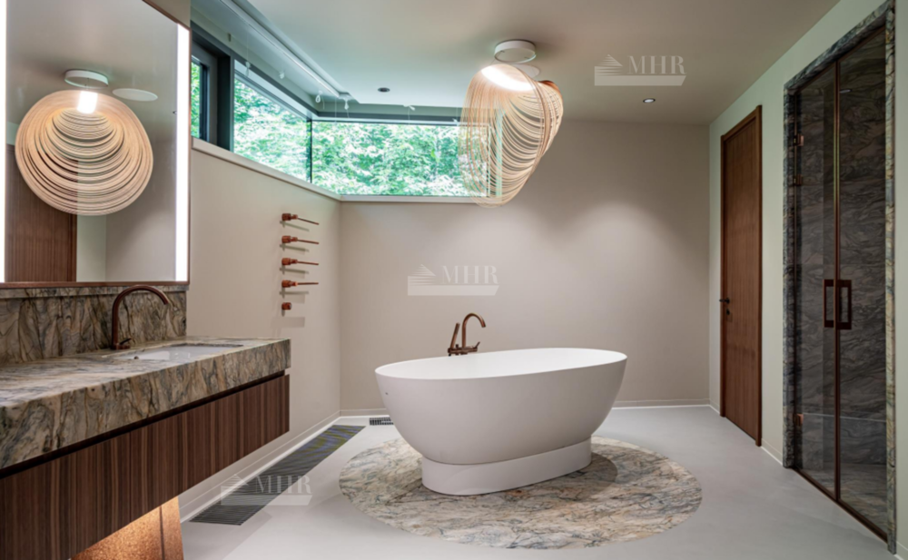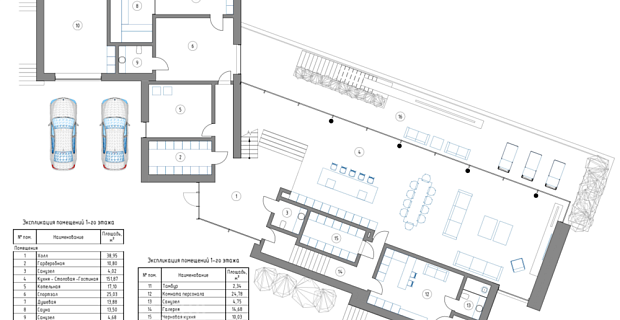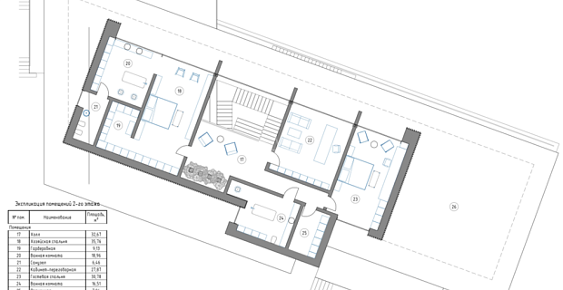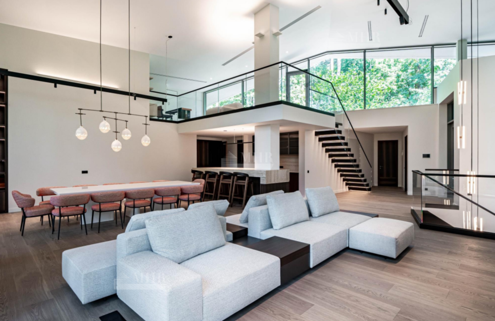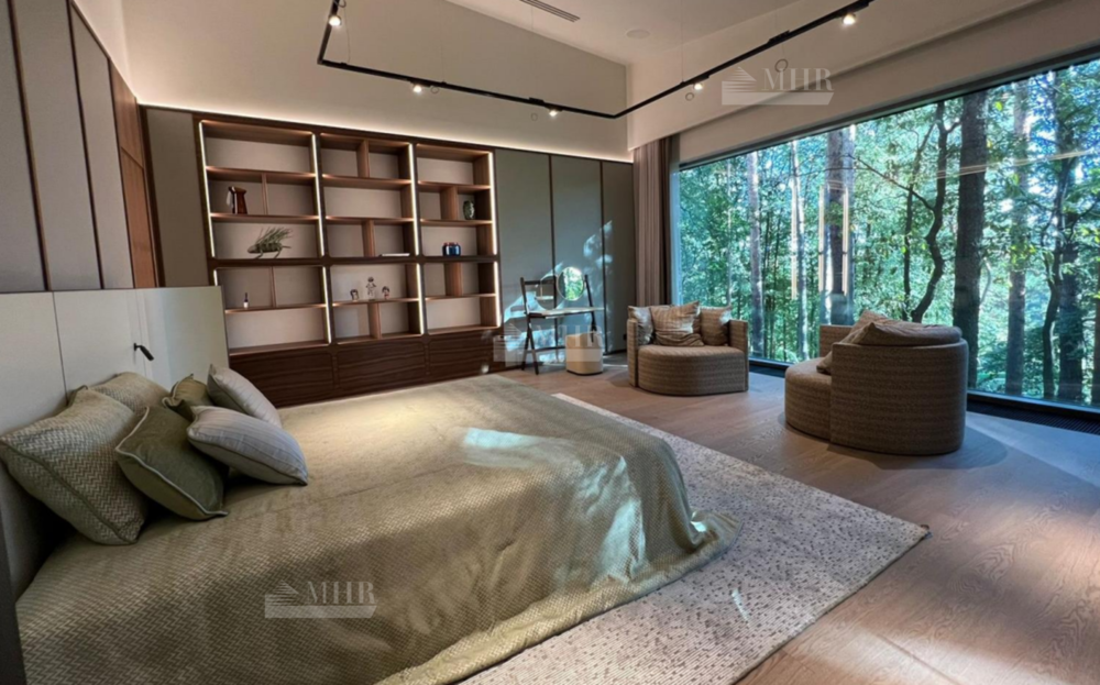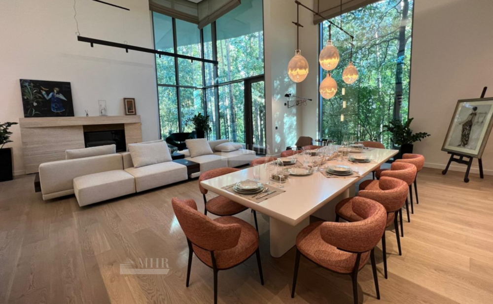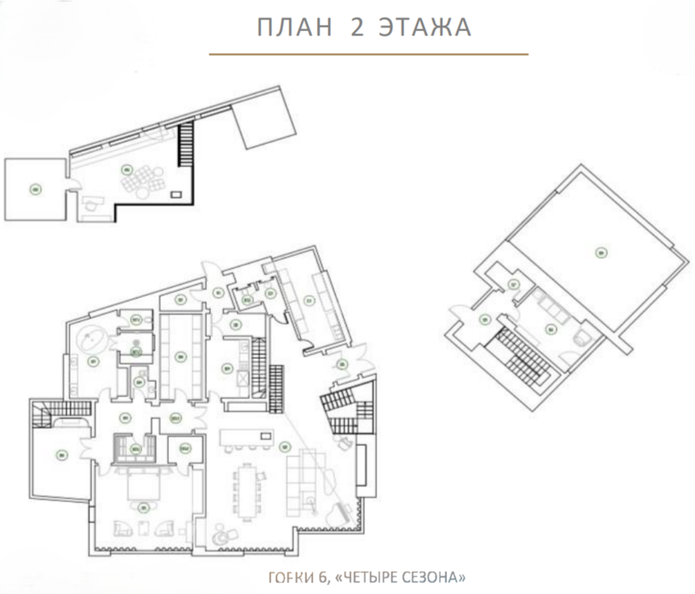 2-й этаж: главная гостиная с дровяным камином, парадная кухня и доготовочная, гардеробная, хозяйский блок: спальня, ванная комната, несколько гардеробных для одежды, спортзал или библиотека, гараж, кабинет или комната водителя, с/у.